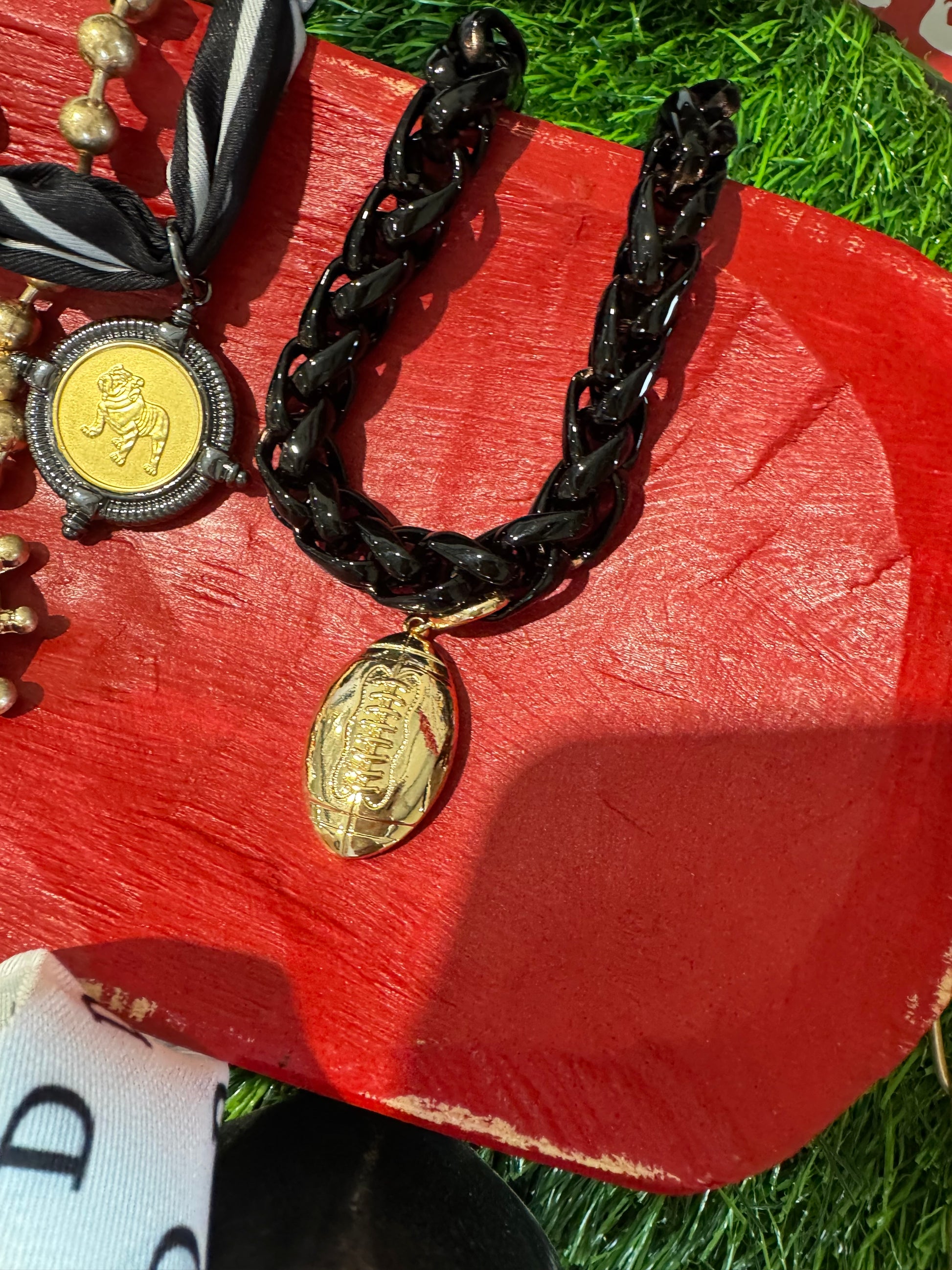 So cute! Metal black chain. Adjustable clasp- about 12 inches long