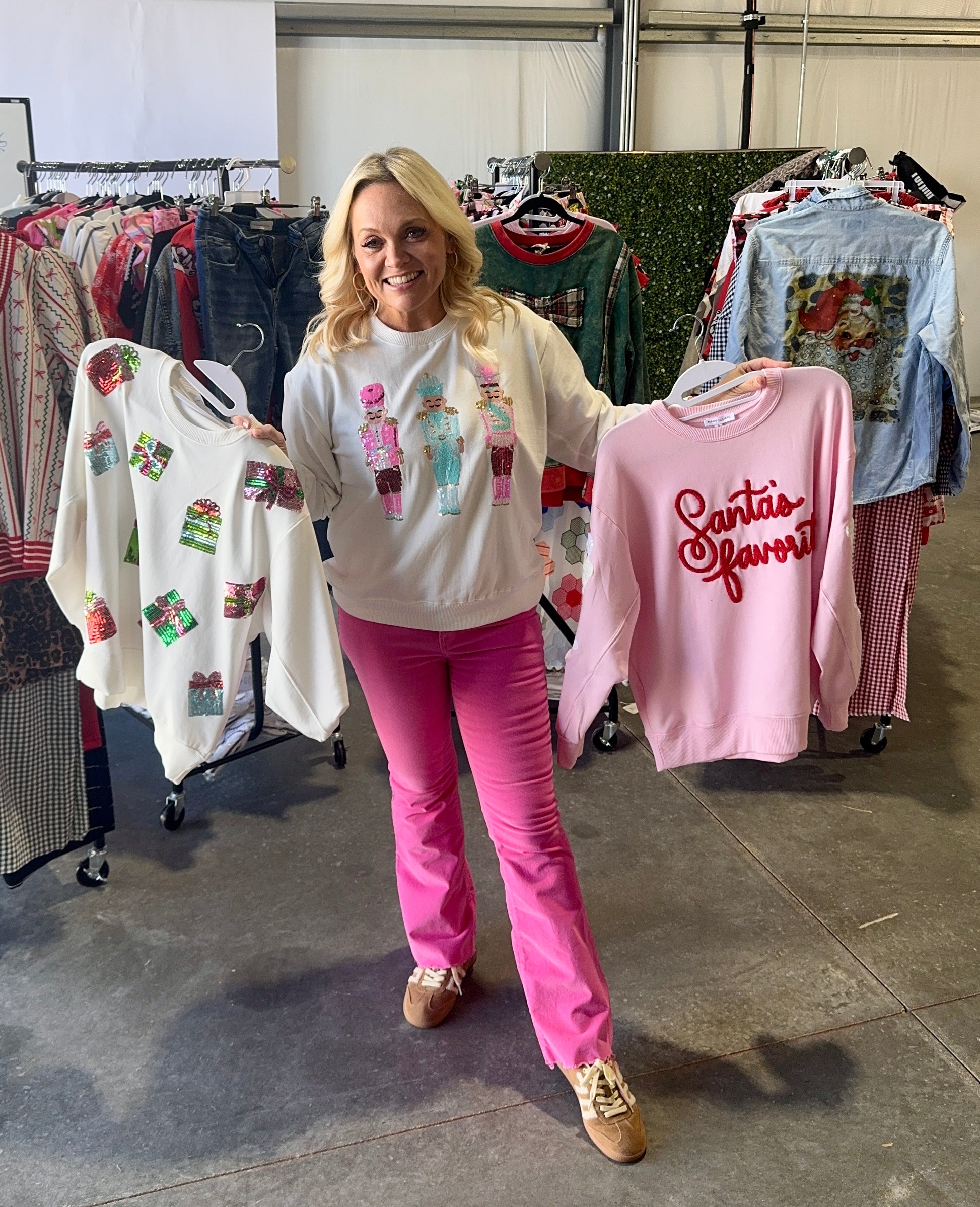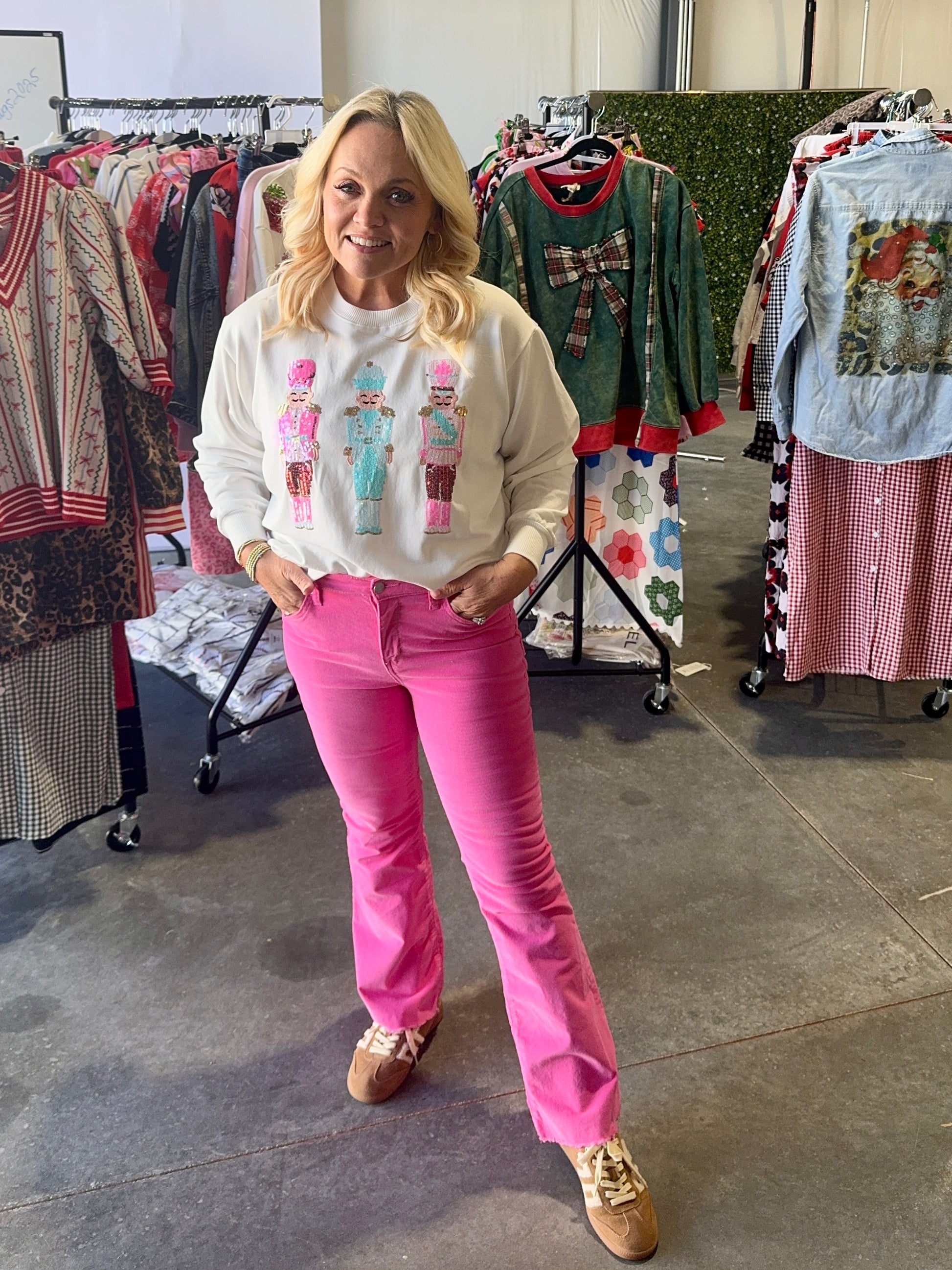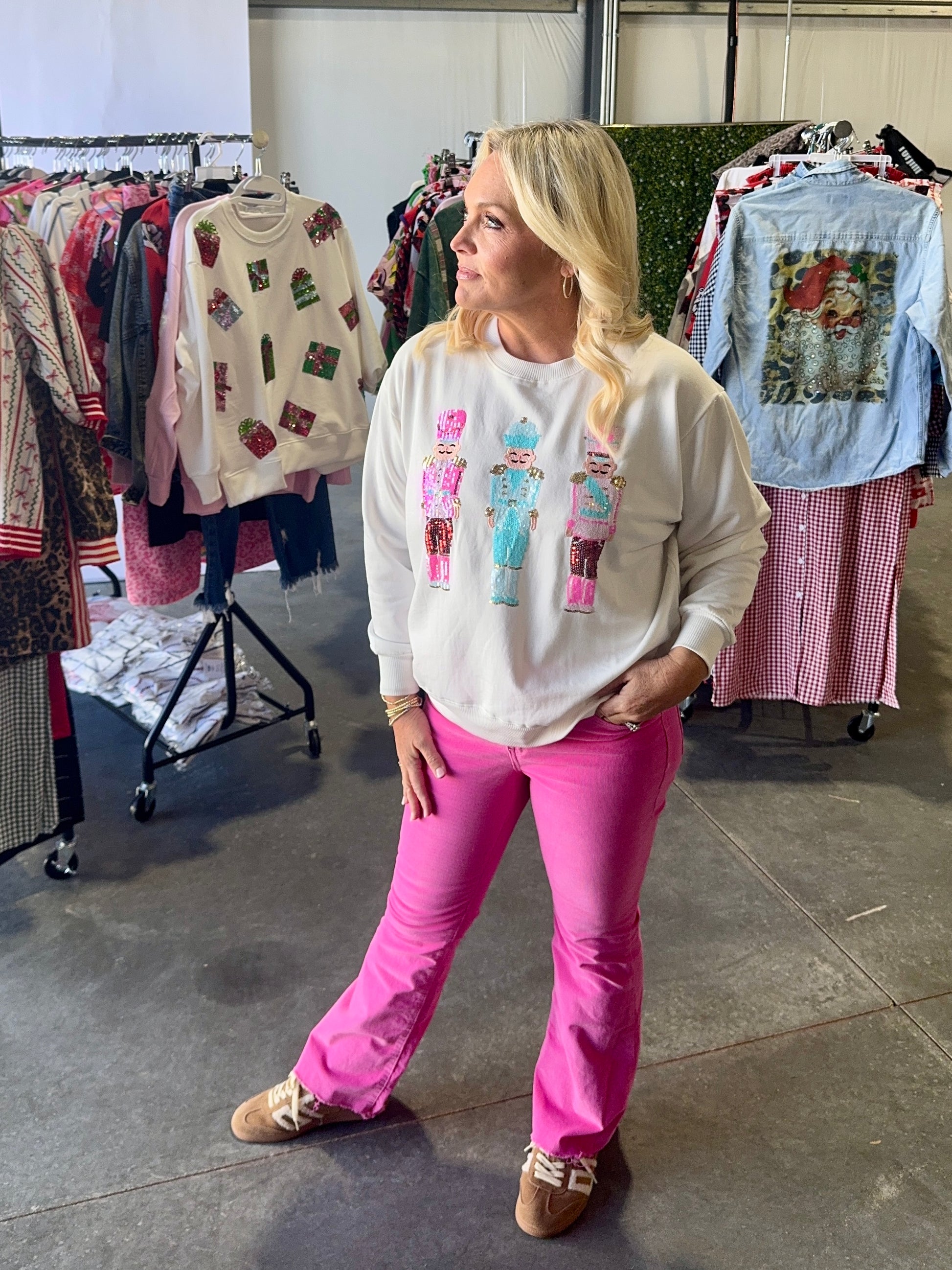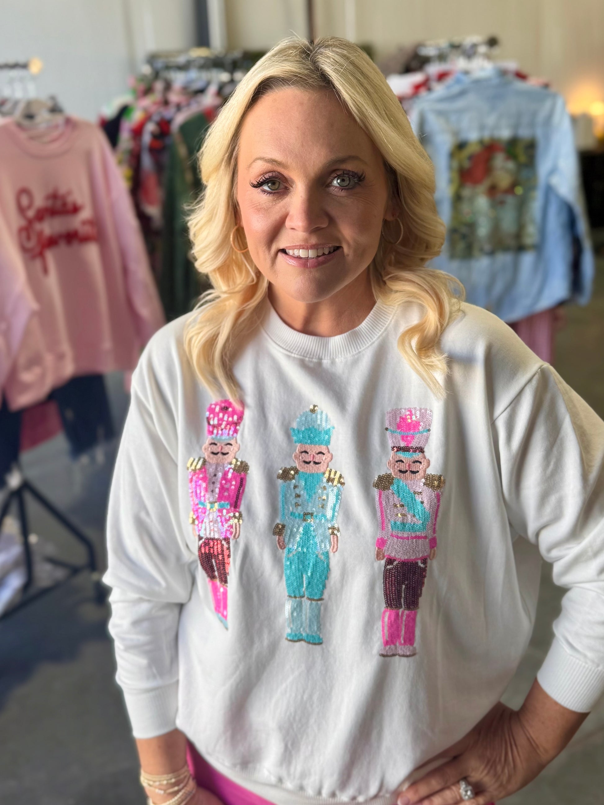 Super soft, high quality Christmas sweatshirt with 3 of the cutest sequin nutcrackers! Fits true to size to a bit oversized. I recommend you go with your typical normal sweatshirt or sweater size.