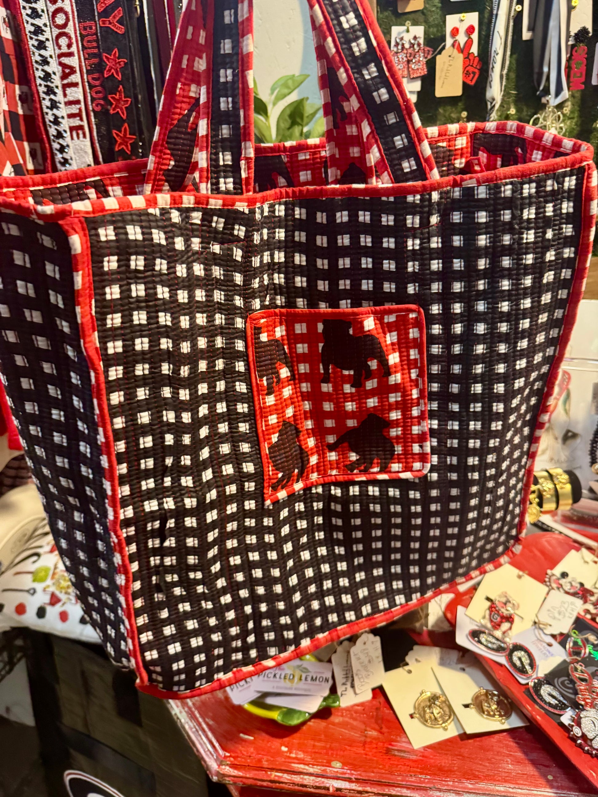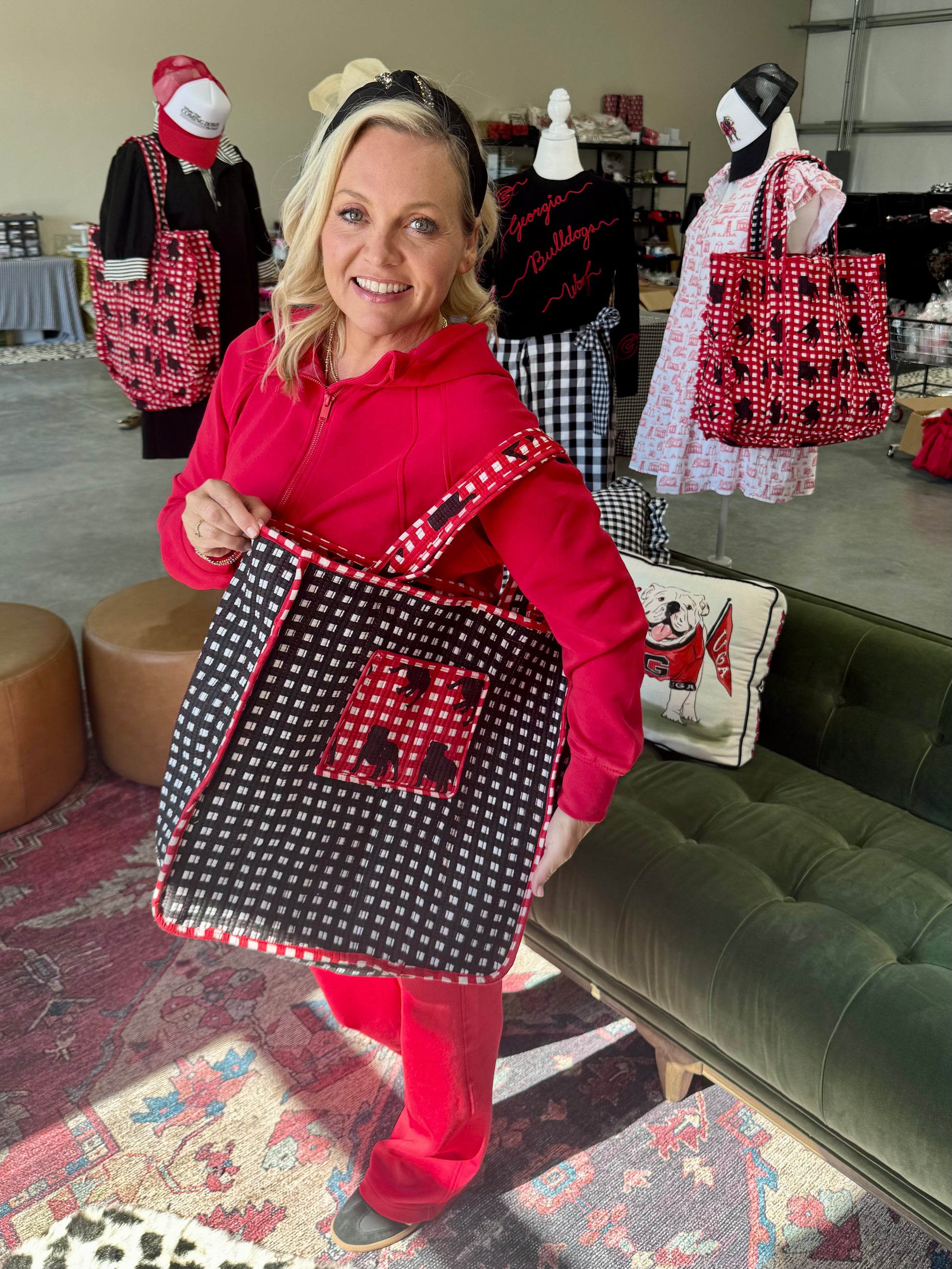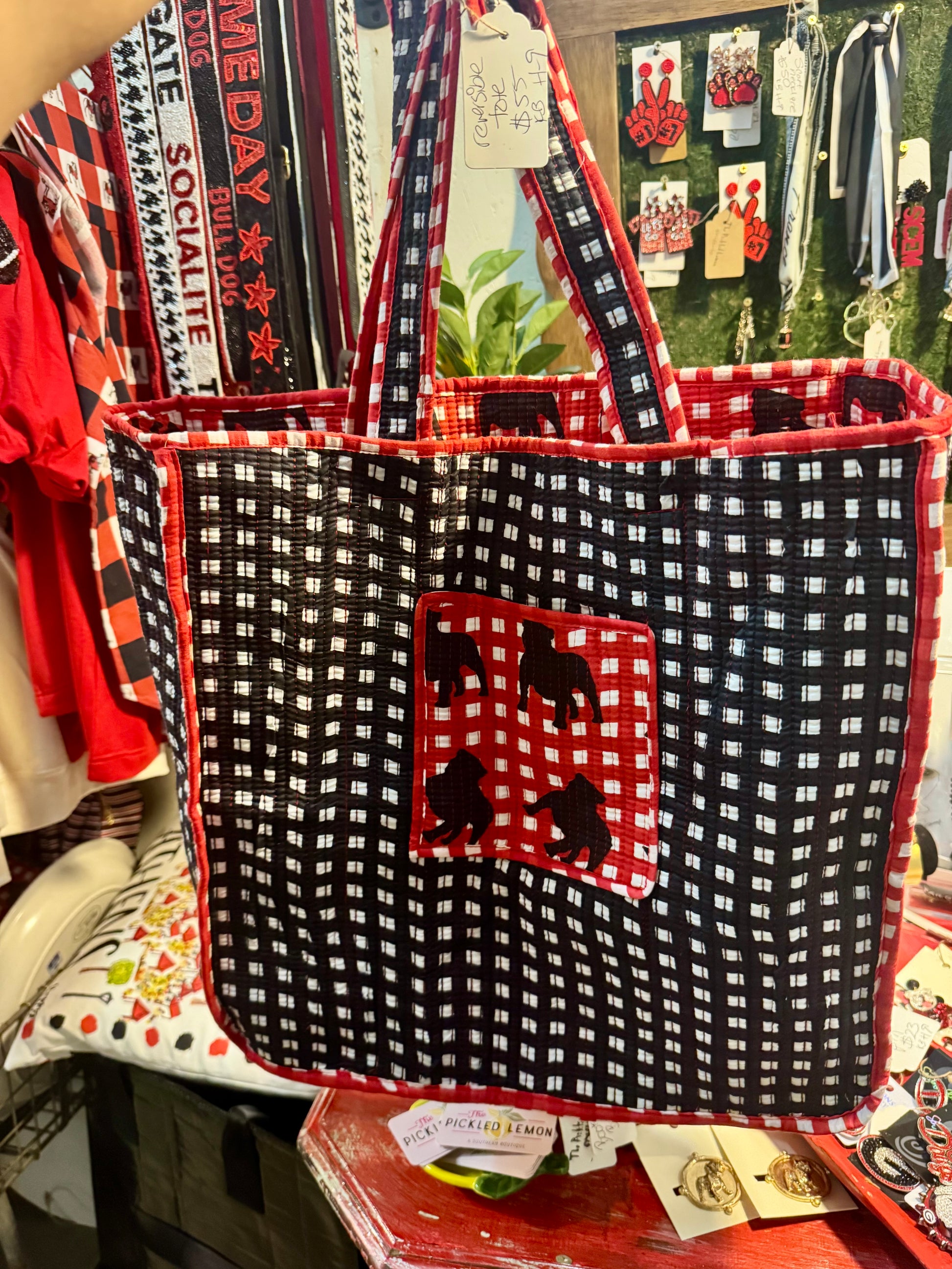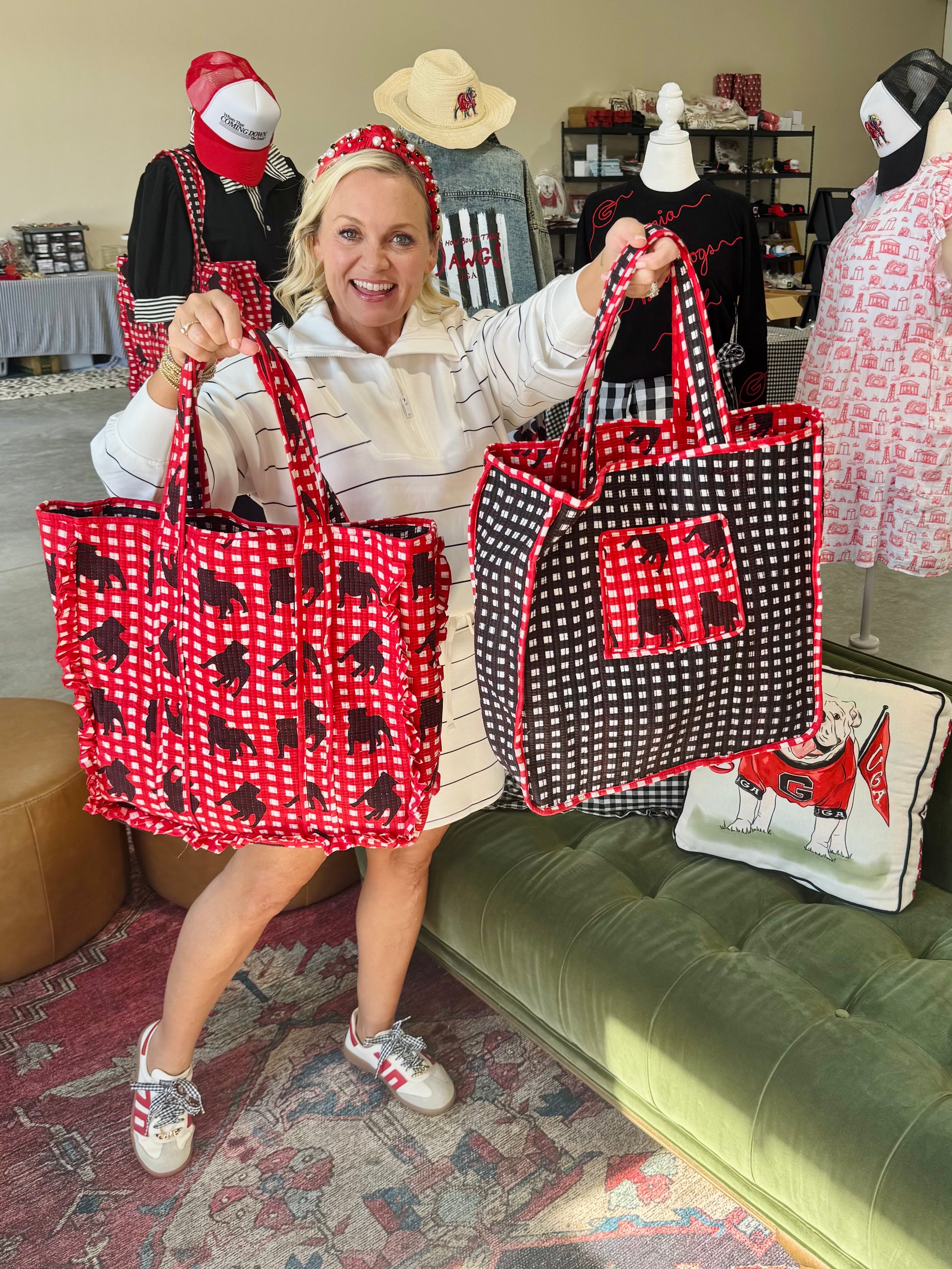 Red gingham and black gingham with bulldogs! these are REVERSIBLE so you can choose what you want! The red gingham side has a ruffle. So fun! These hold tons! Extra large