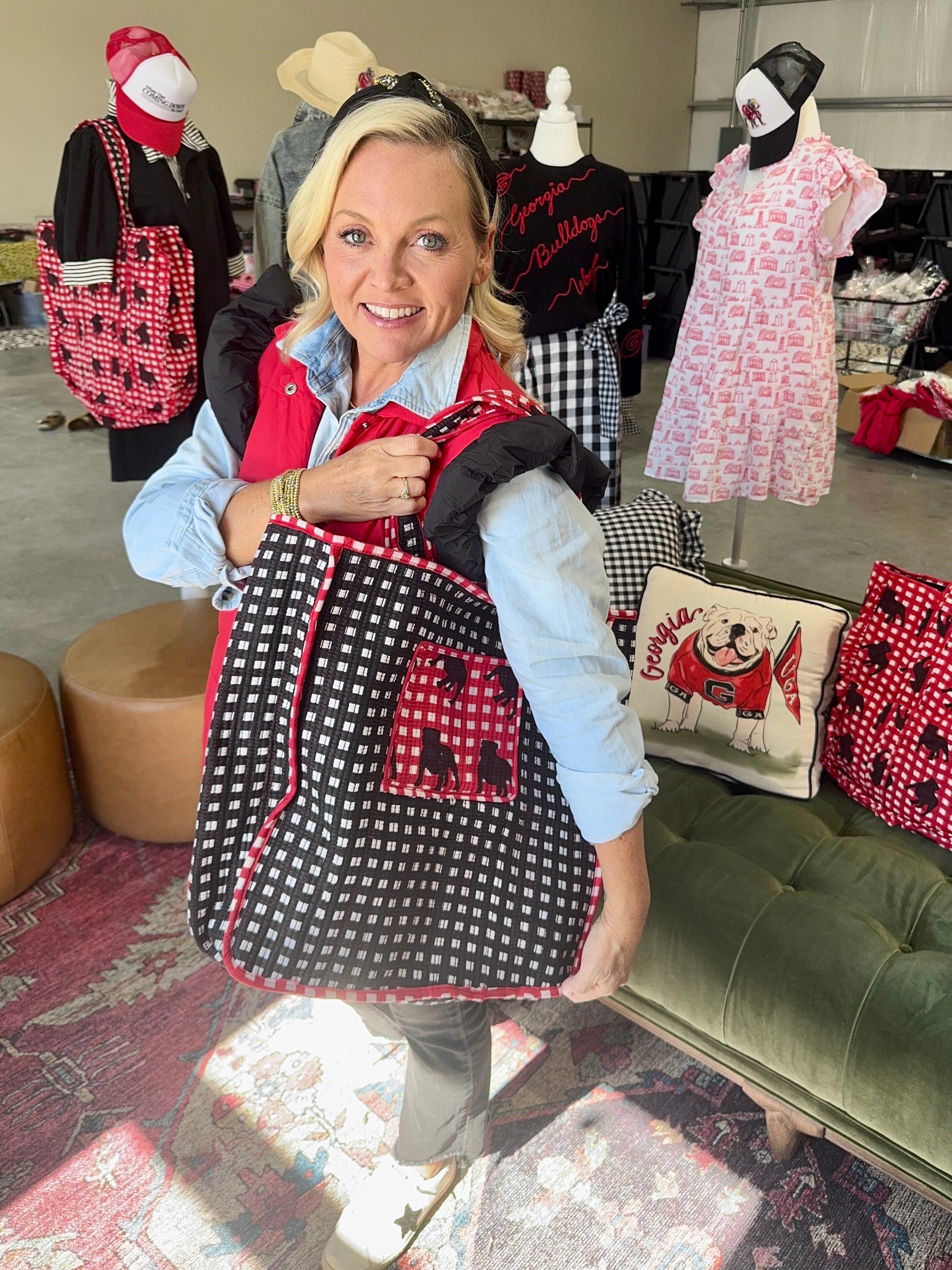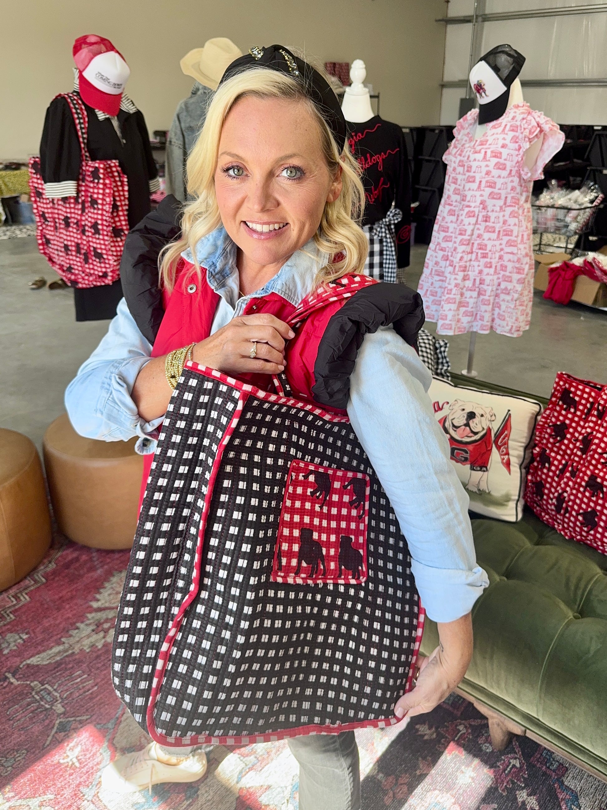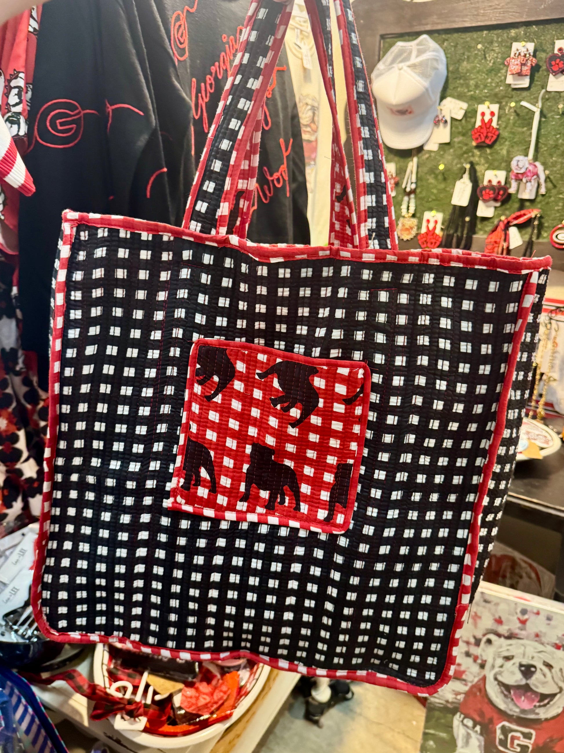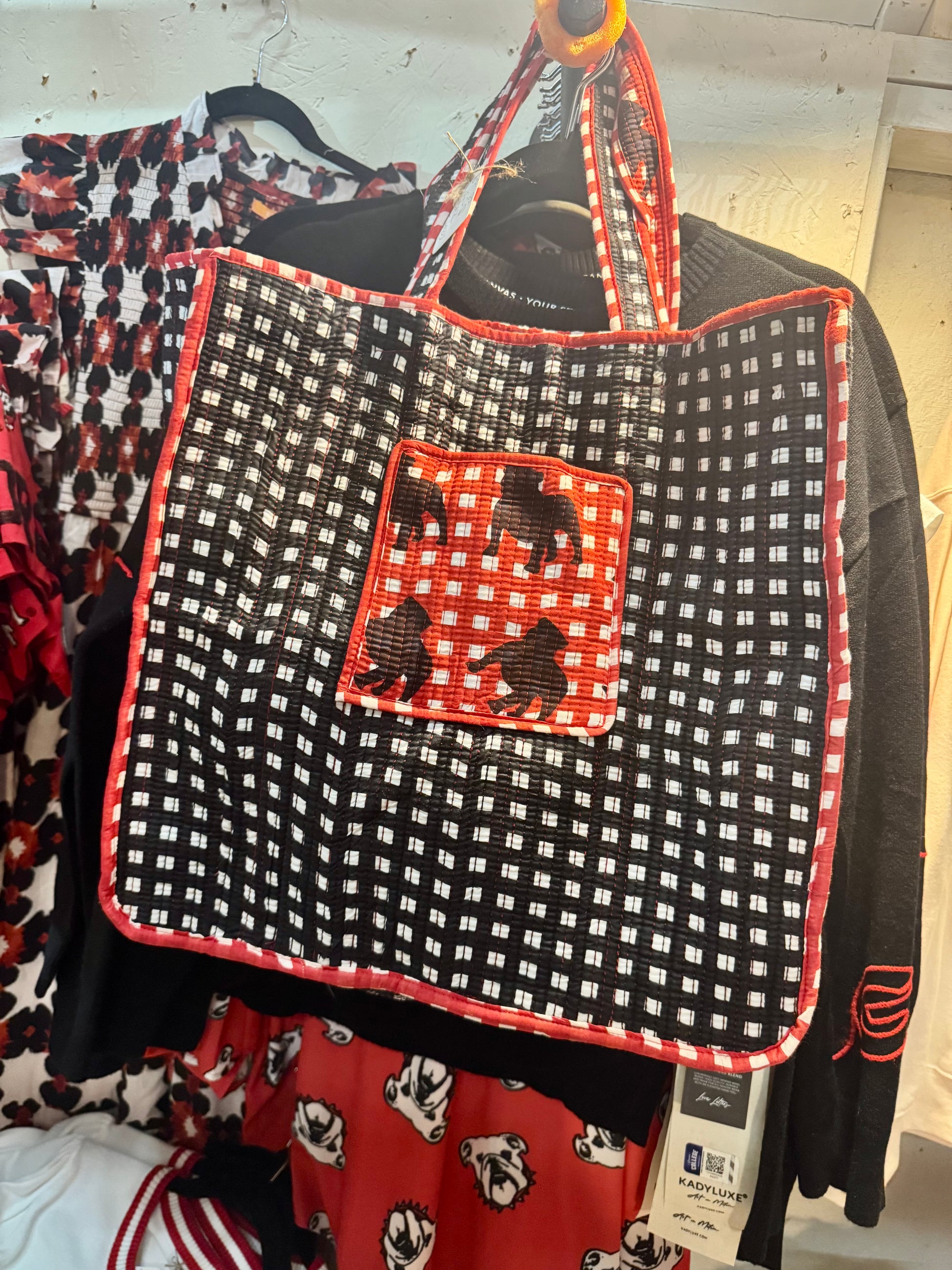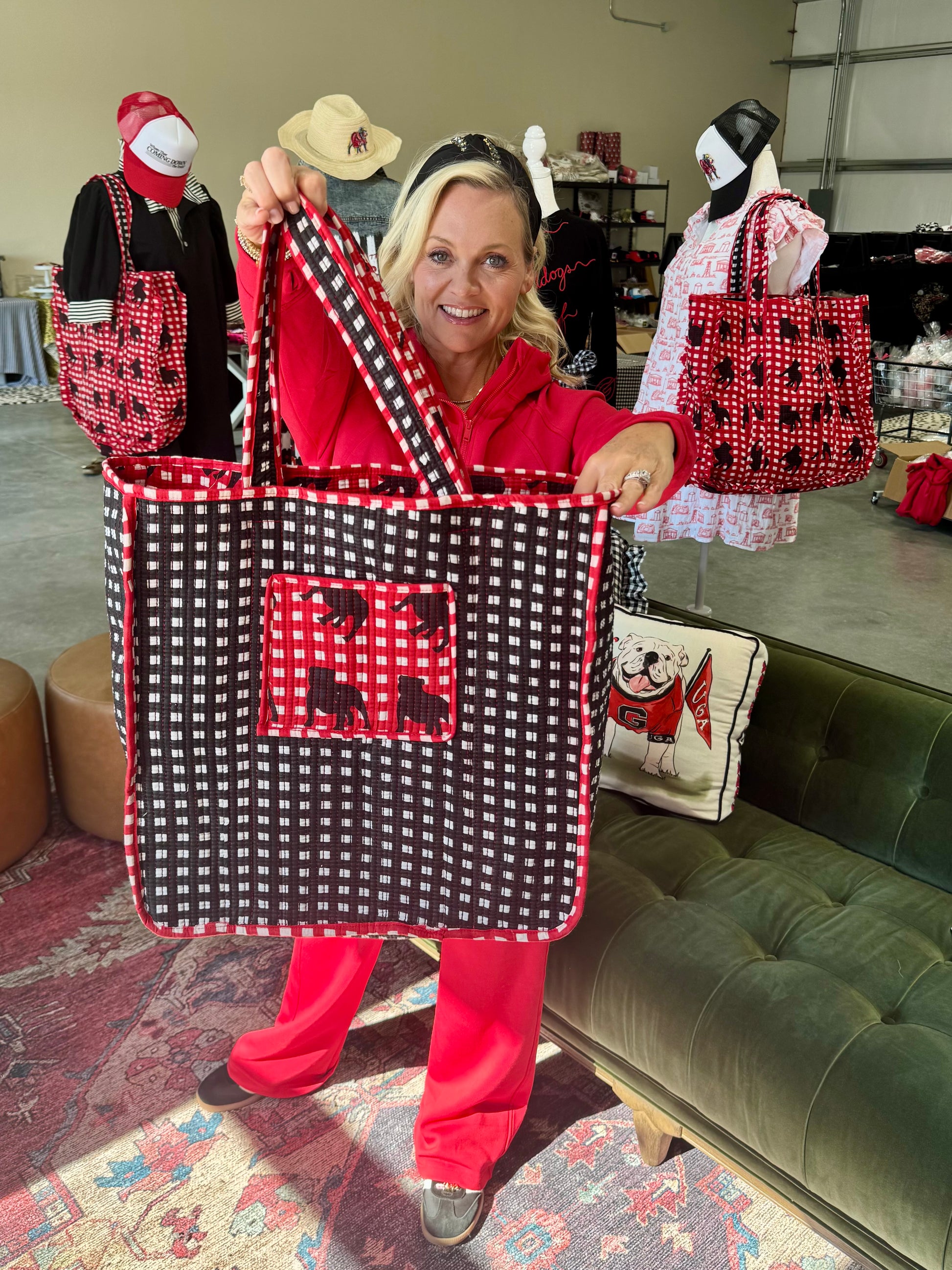 Red gingham and black gingham with bulldogs! these are REVERSIBLE so you can choose what you want! The red gingham side has a ruffle. So fun! These hold tons! Extra large