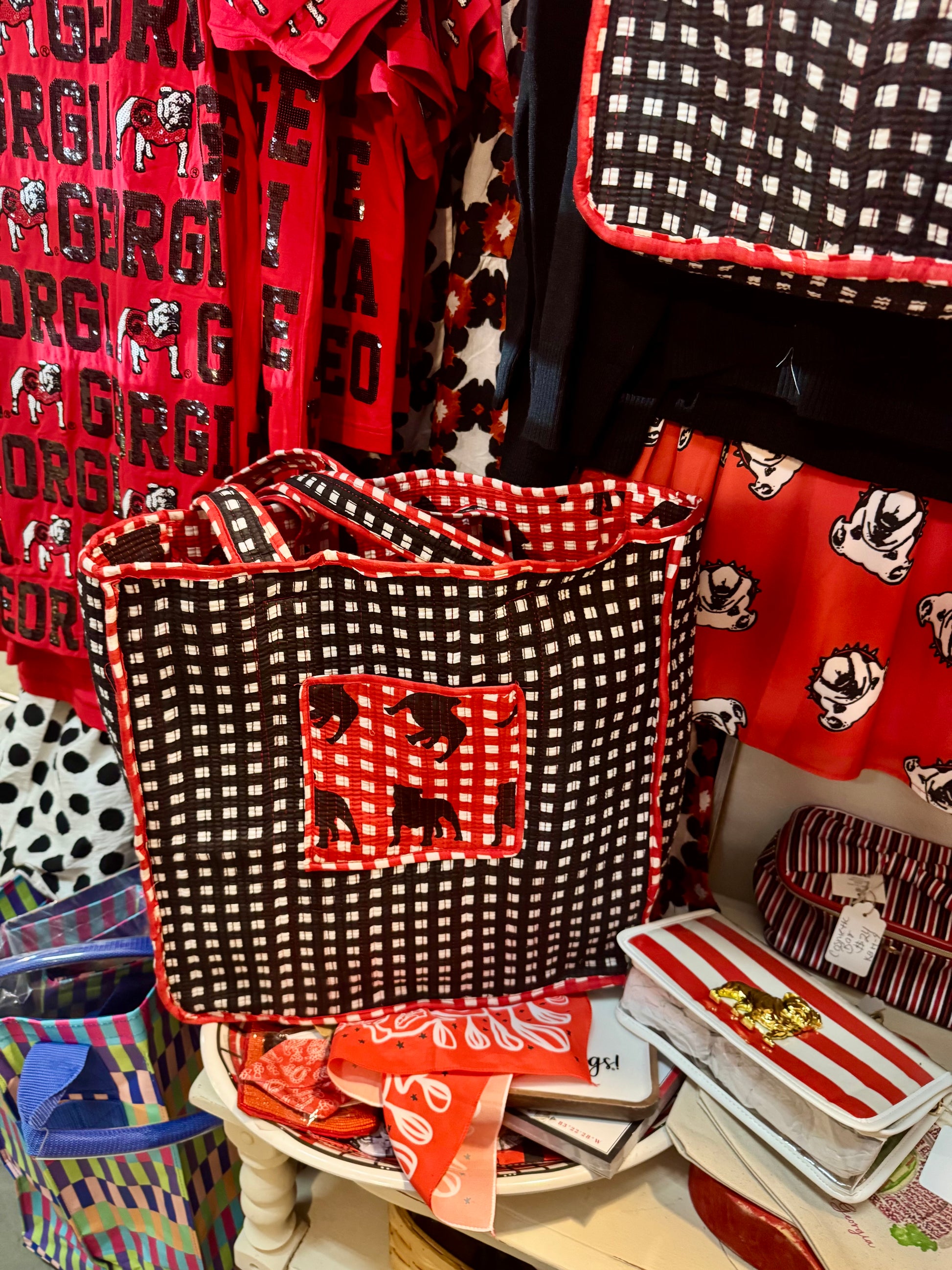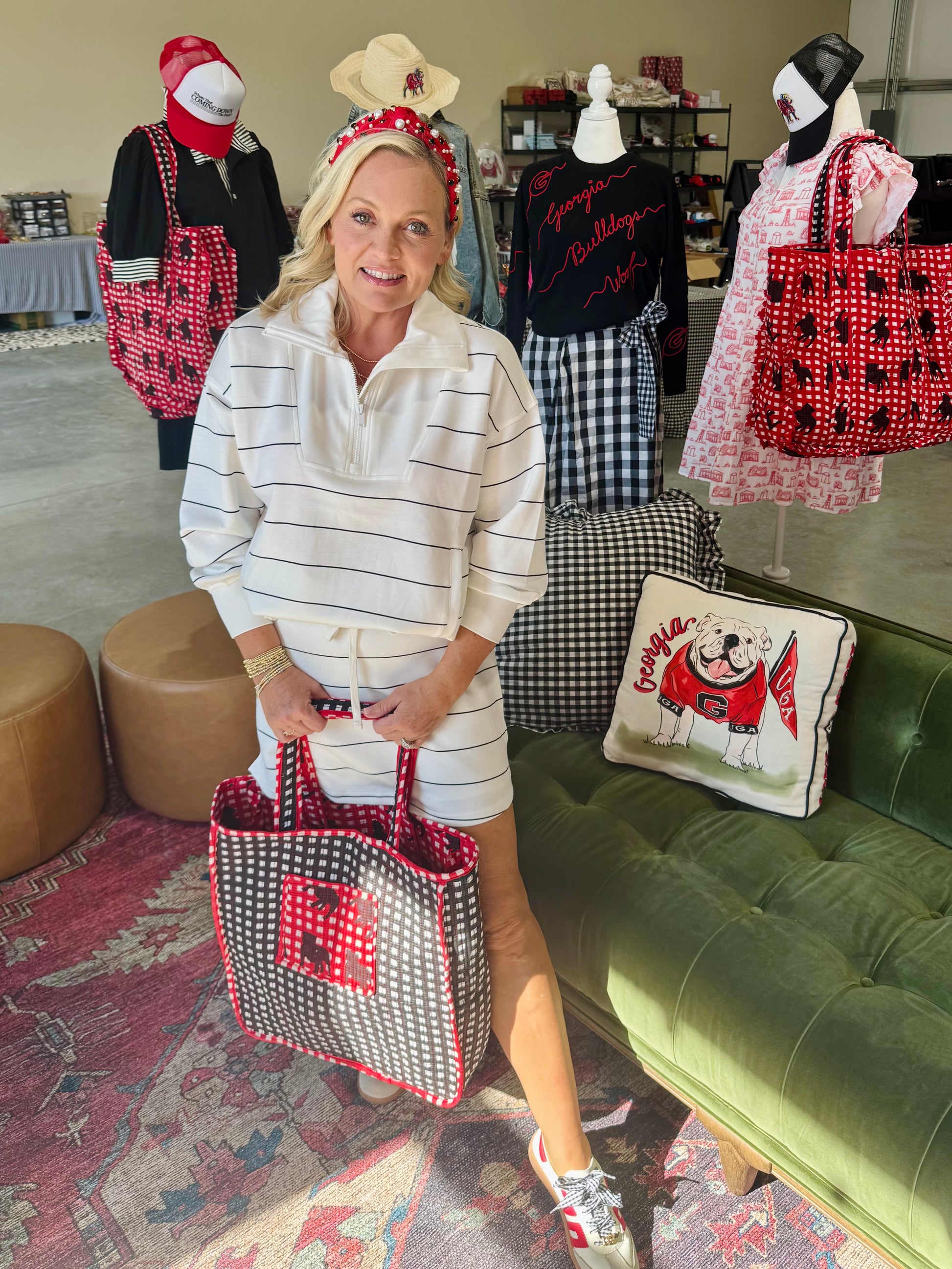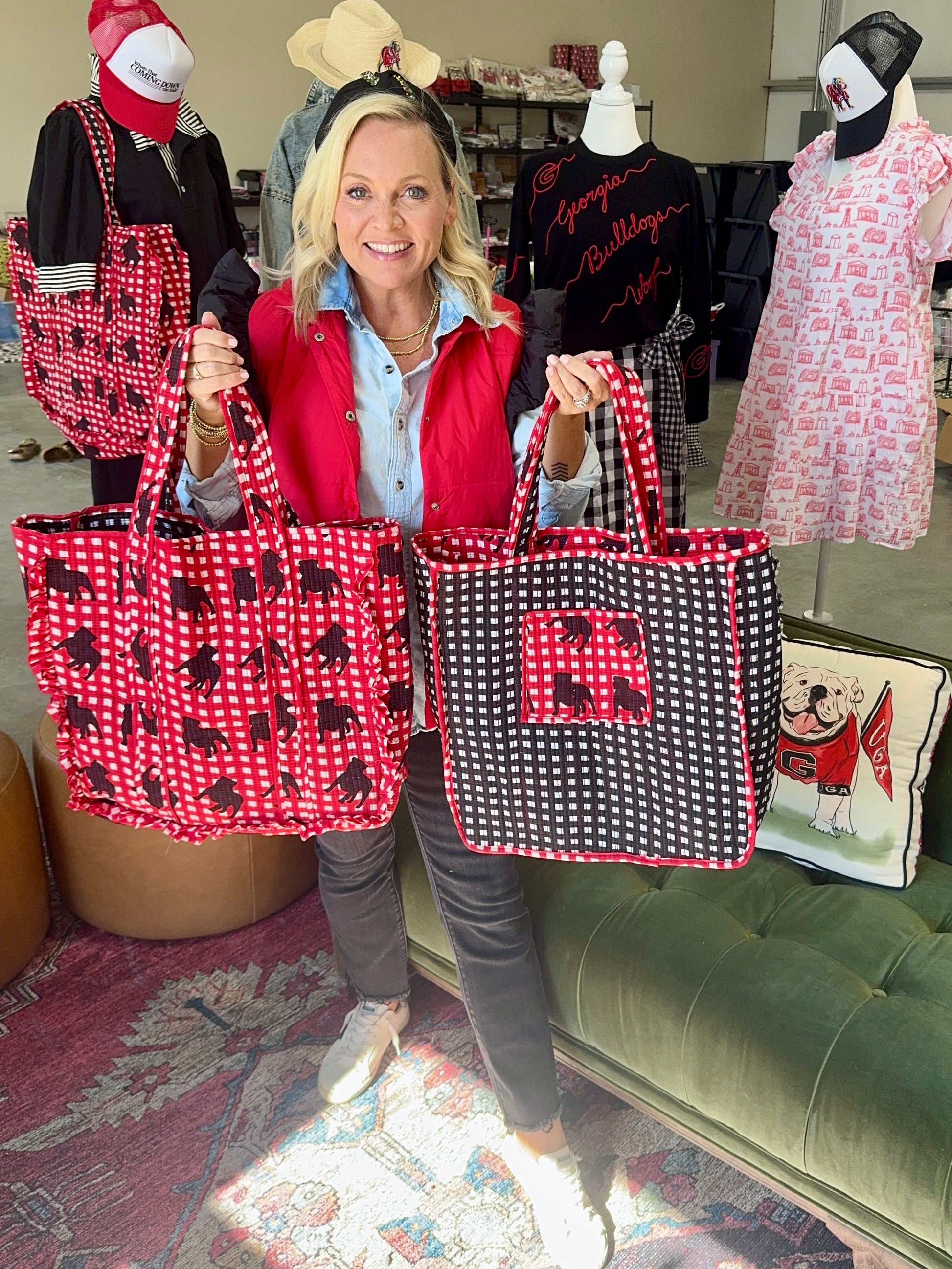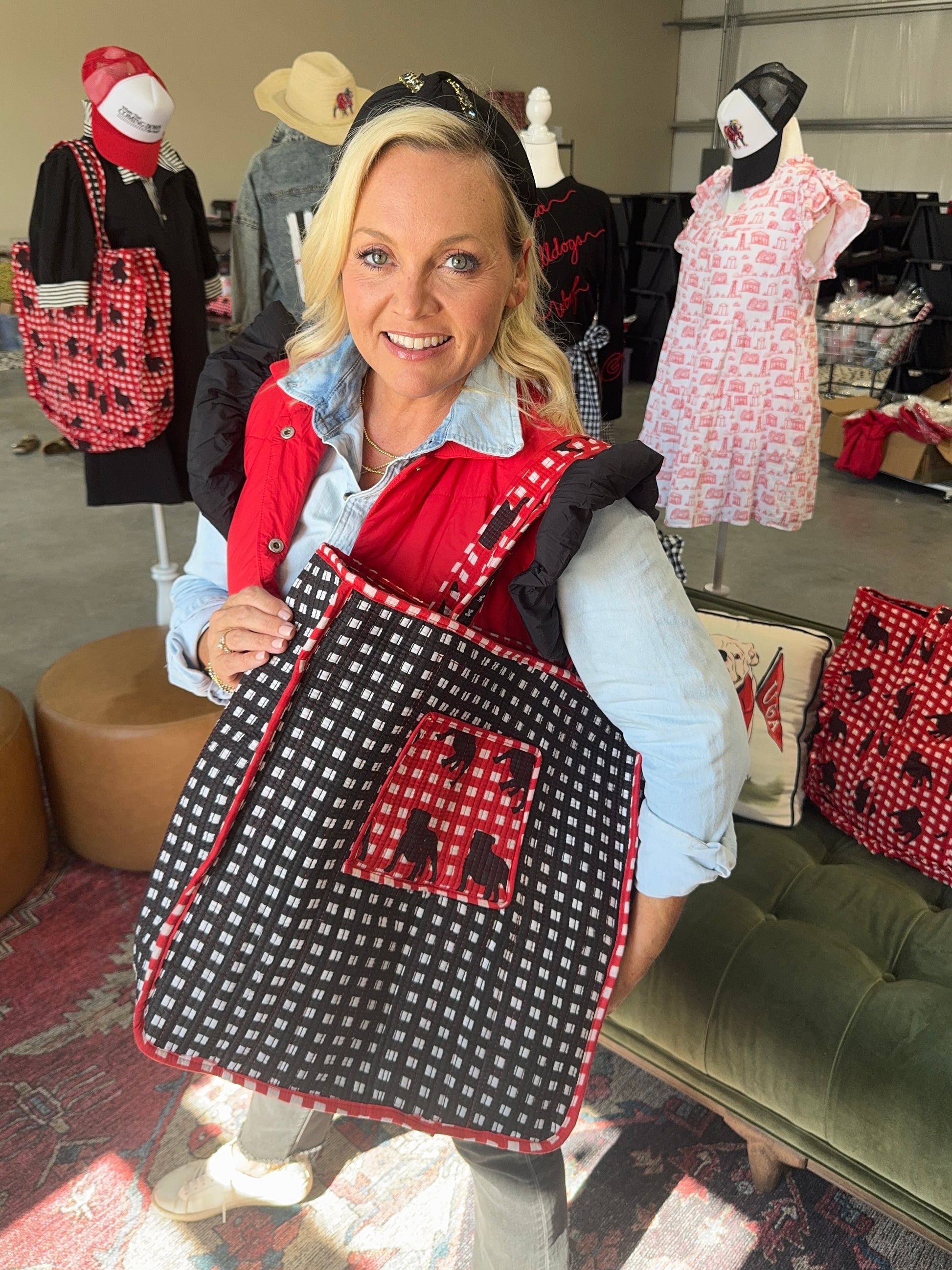 Red gingham and black gingham with bulldogs! these are REVERSIBLE so you can choose what you want! The red gingham side has a ruffle. So fun! These hold tons! Extra large