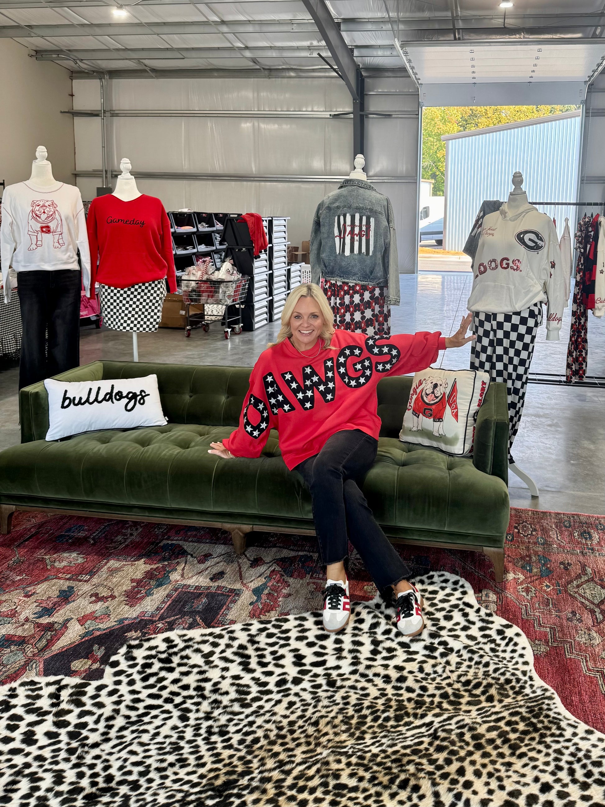 This Georgia Stewart Simmons Balloon Sleeve Pullover combines cozy comfort with playful charm, featuring soft fabric, a relaxed fit, and standout balloon sleeves for a feminine twist! The bold DAWGS script with rhinestone stars across the front makes it the perfect pick for layering on breezy game days, tailgates, or casual weekends. It’s an easy favorite for the Dawg fan who loves to show off her team spirit—with a little flair!
