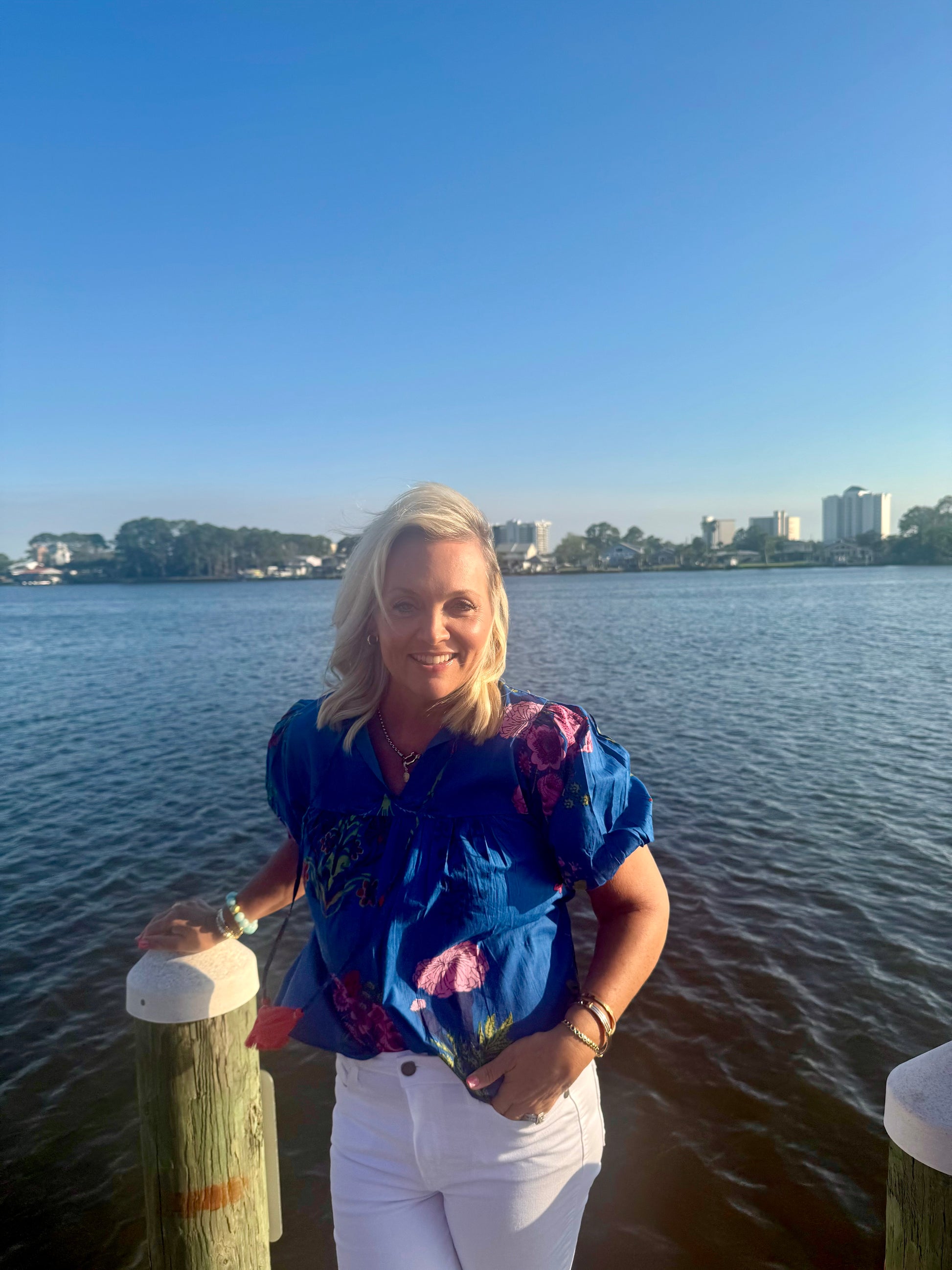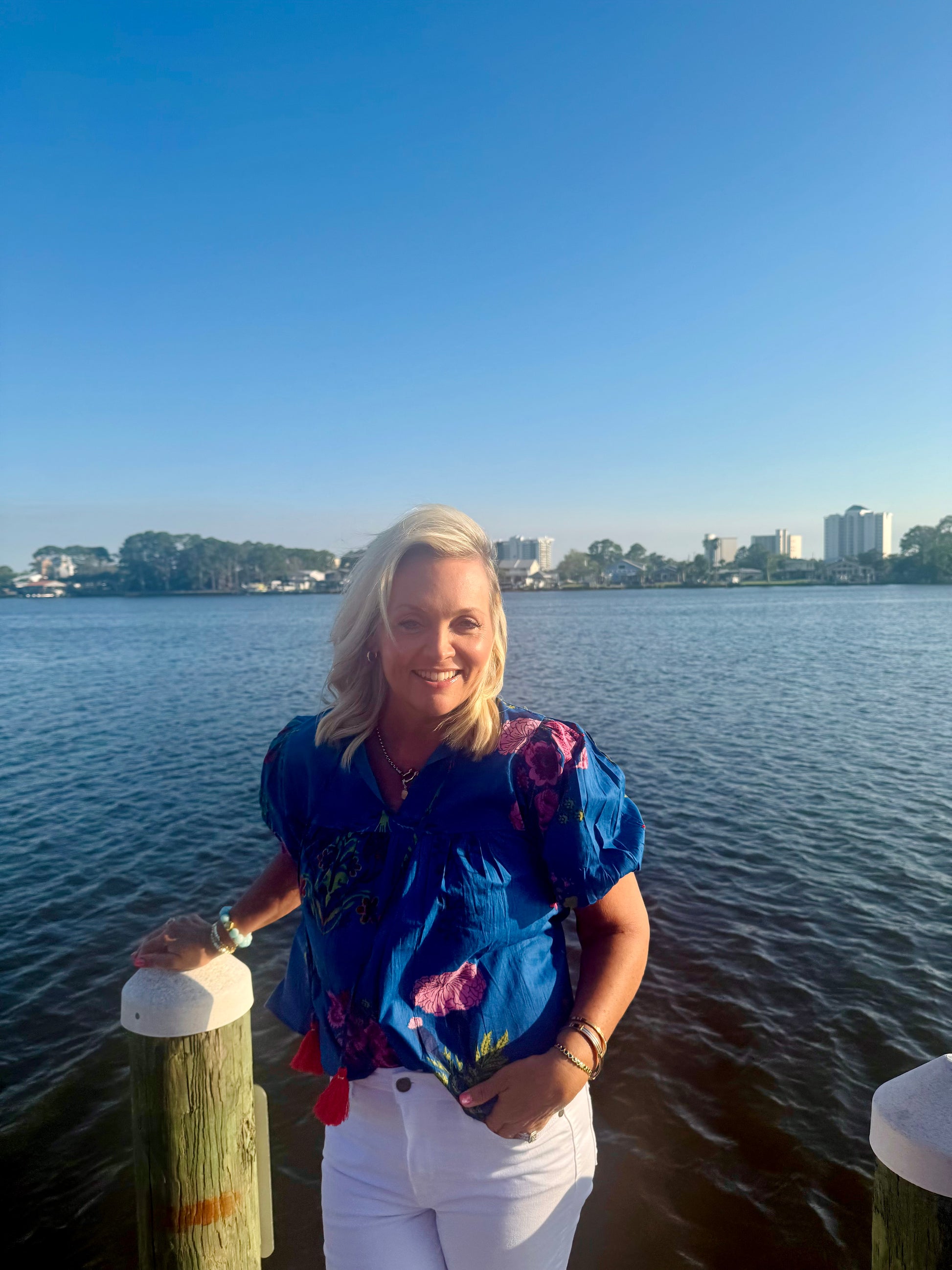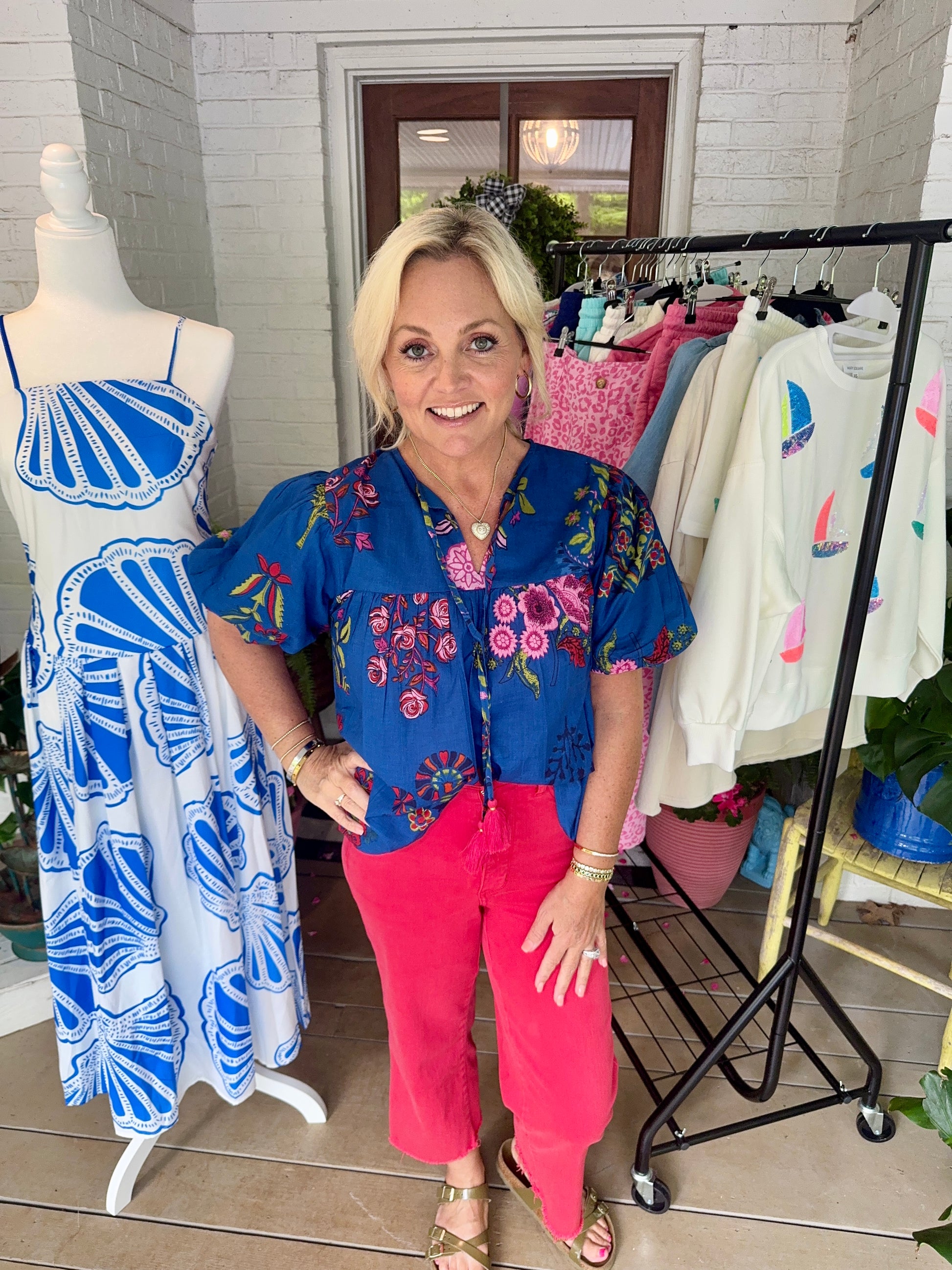 Summer blouse, navy with pink ties. Blousy oversized fit. This is so comfy and breezy fit! Looks great with white or red jeans!