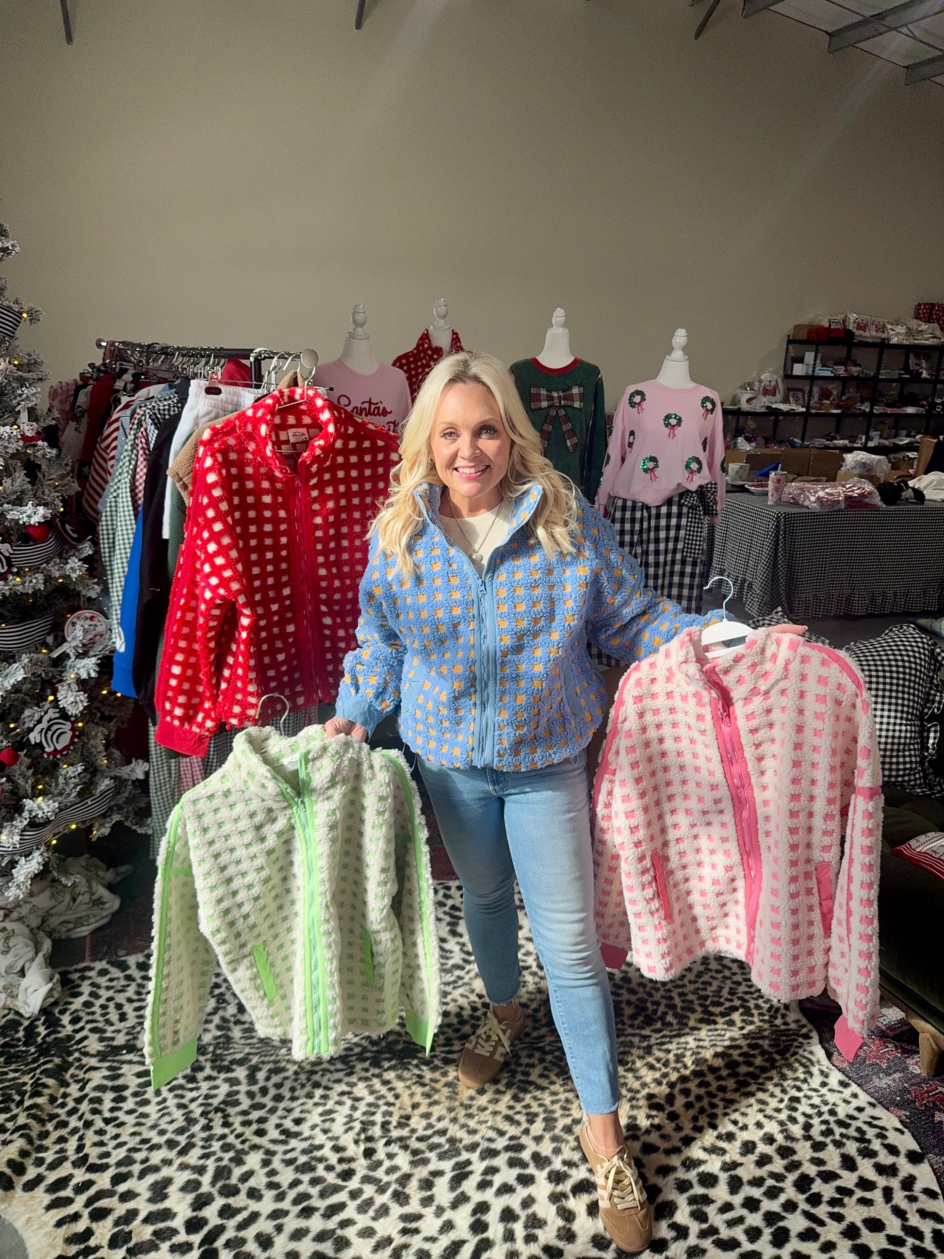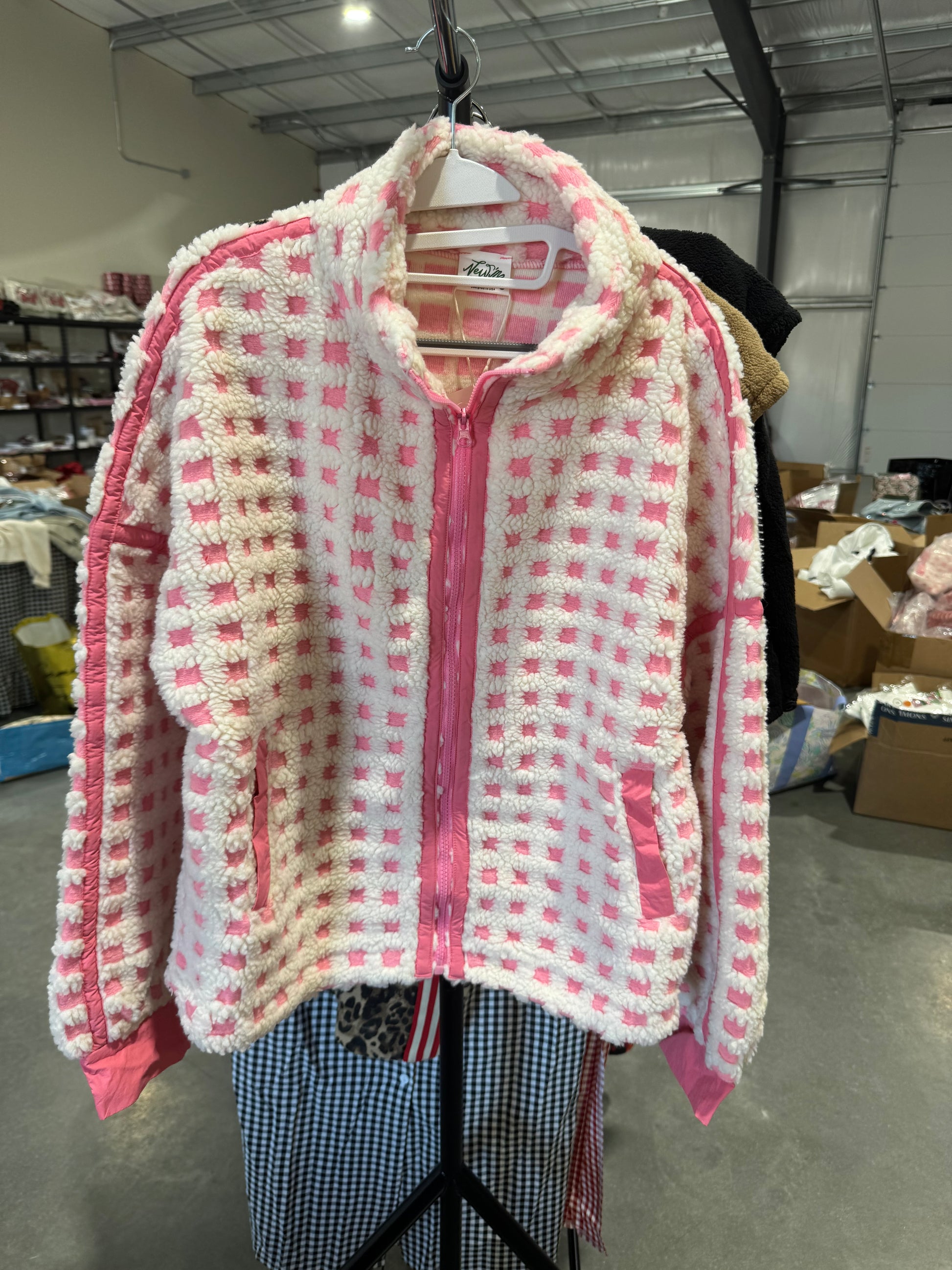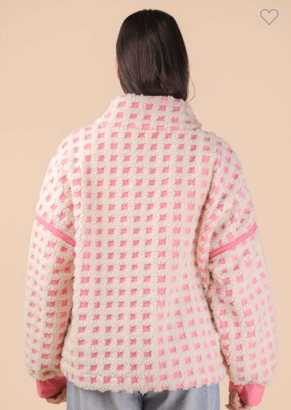 This is the coziest jacket! Cinches on the side. So you can blouse it out. Giving it a whole cool look! Super soft and fun! Get the viral jacket everyone is wanting! Pink and cream