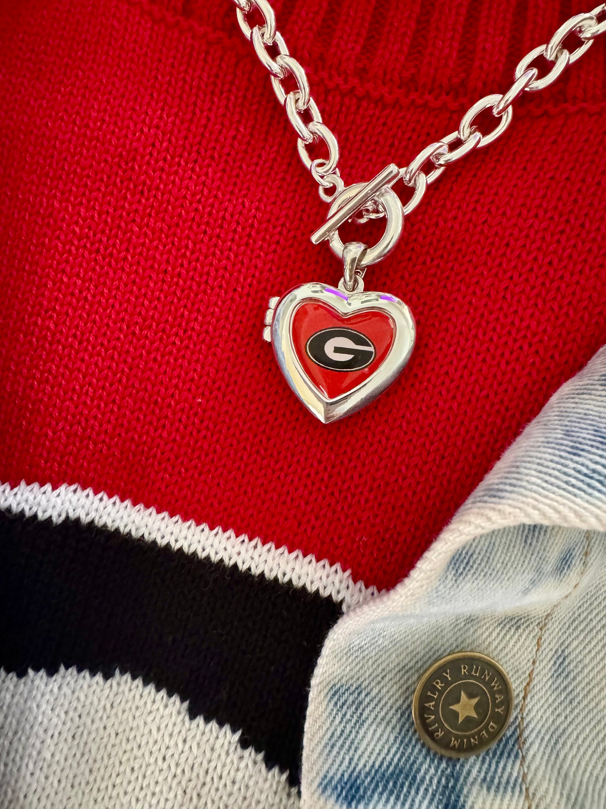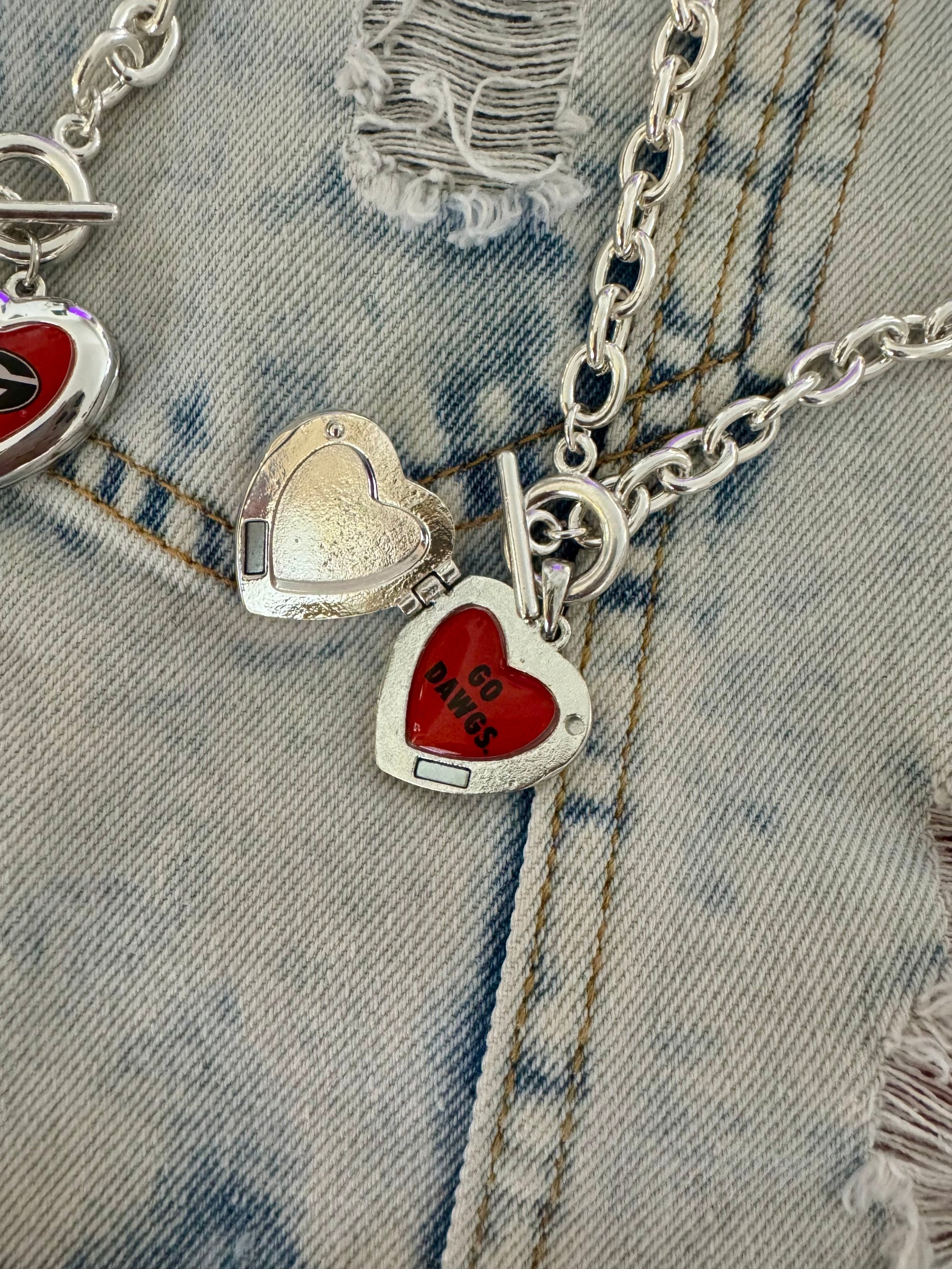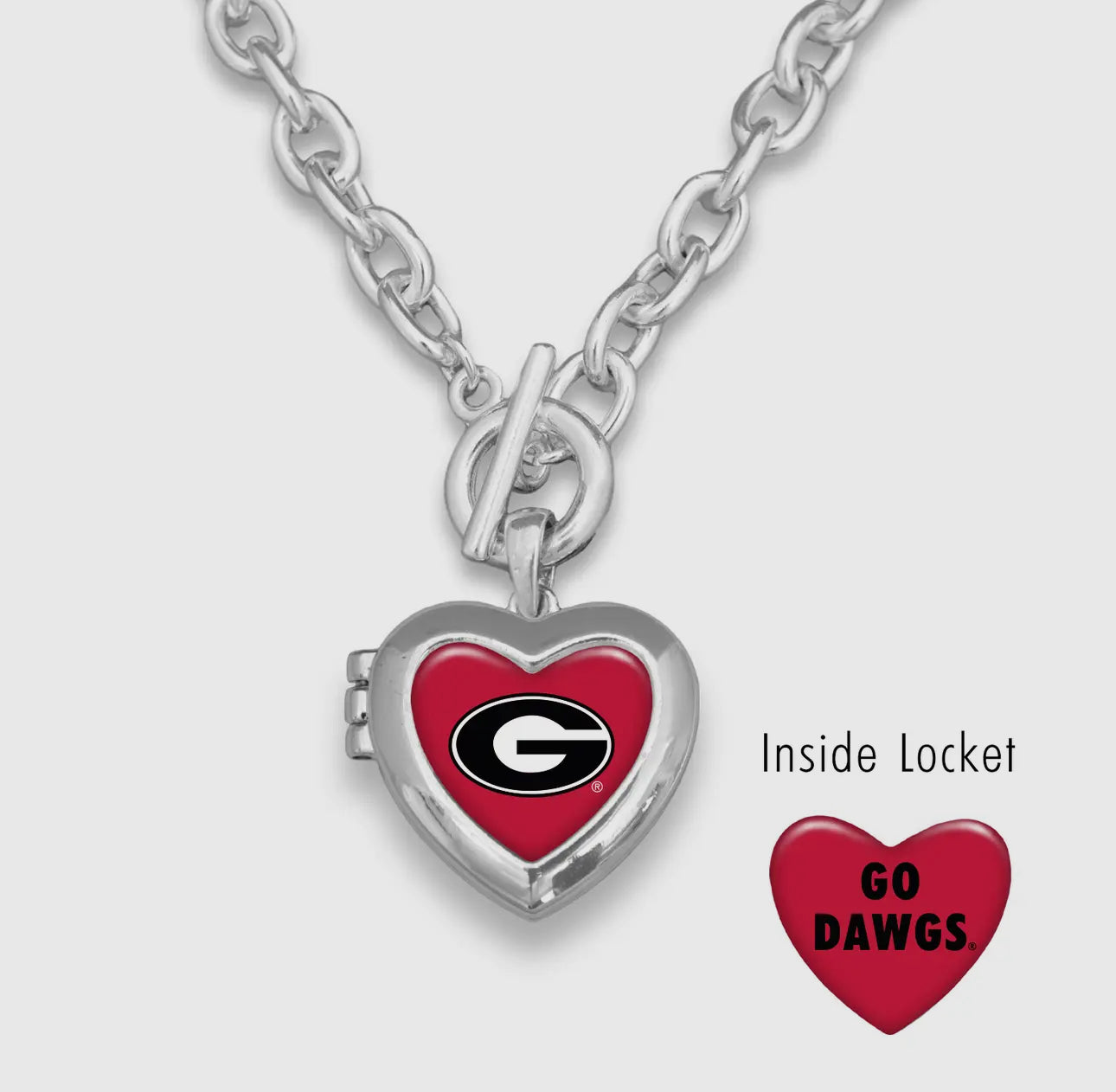 Zinc alloy, and sealed with anti tarnish coating. Says Go dawgs inside locket.