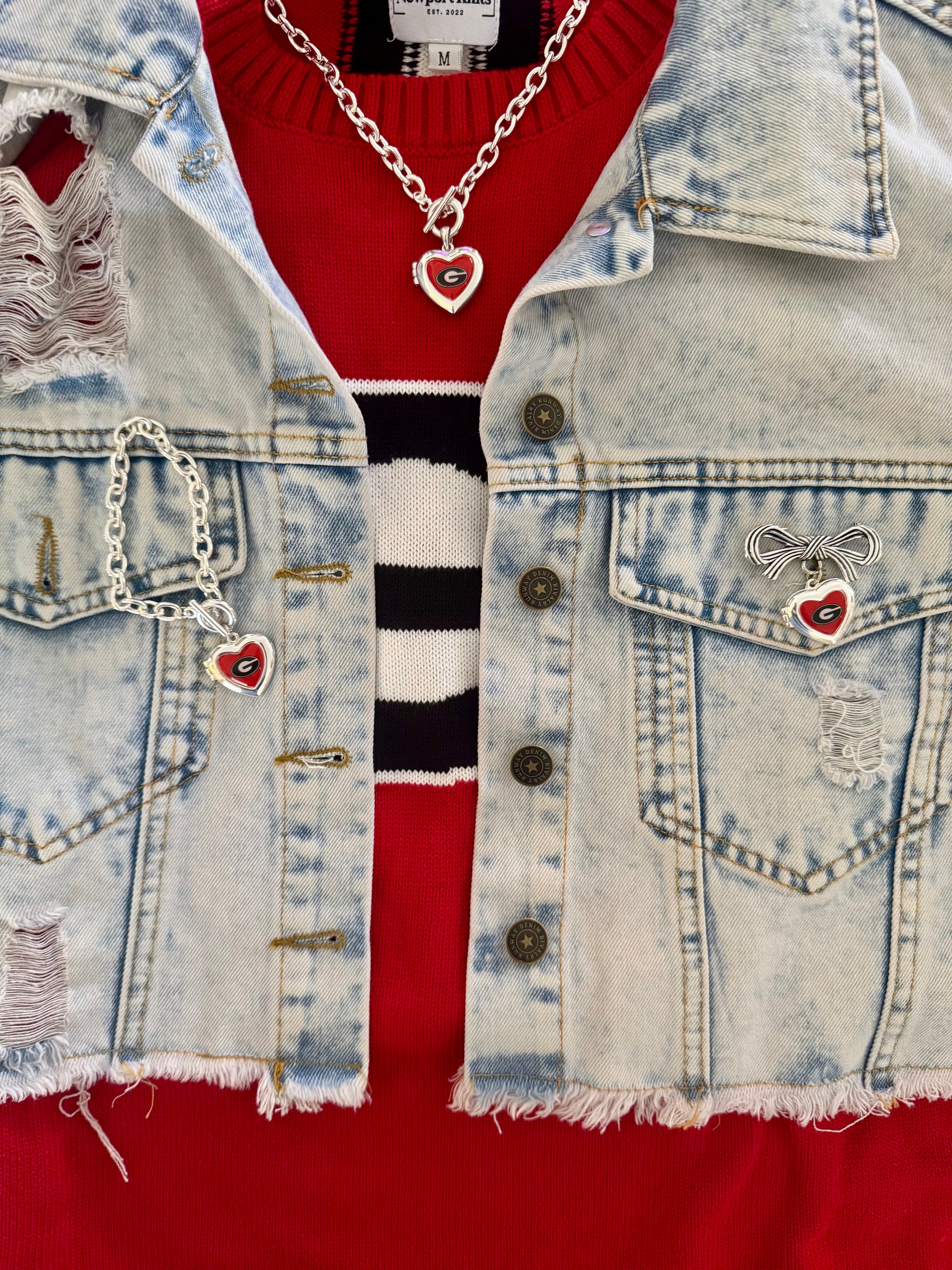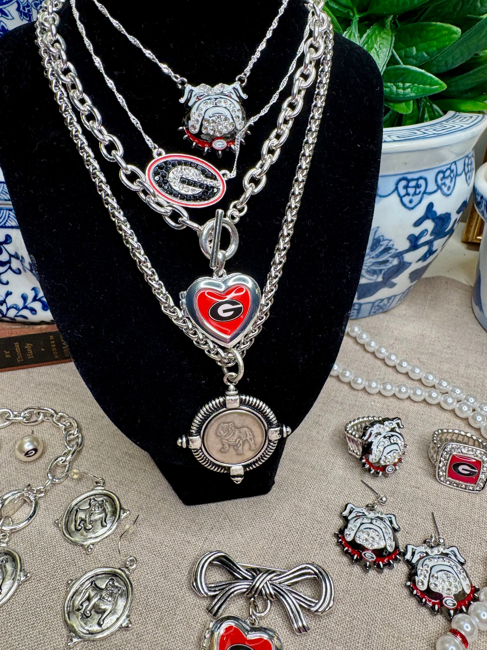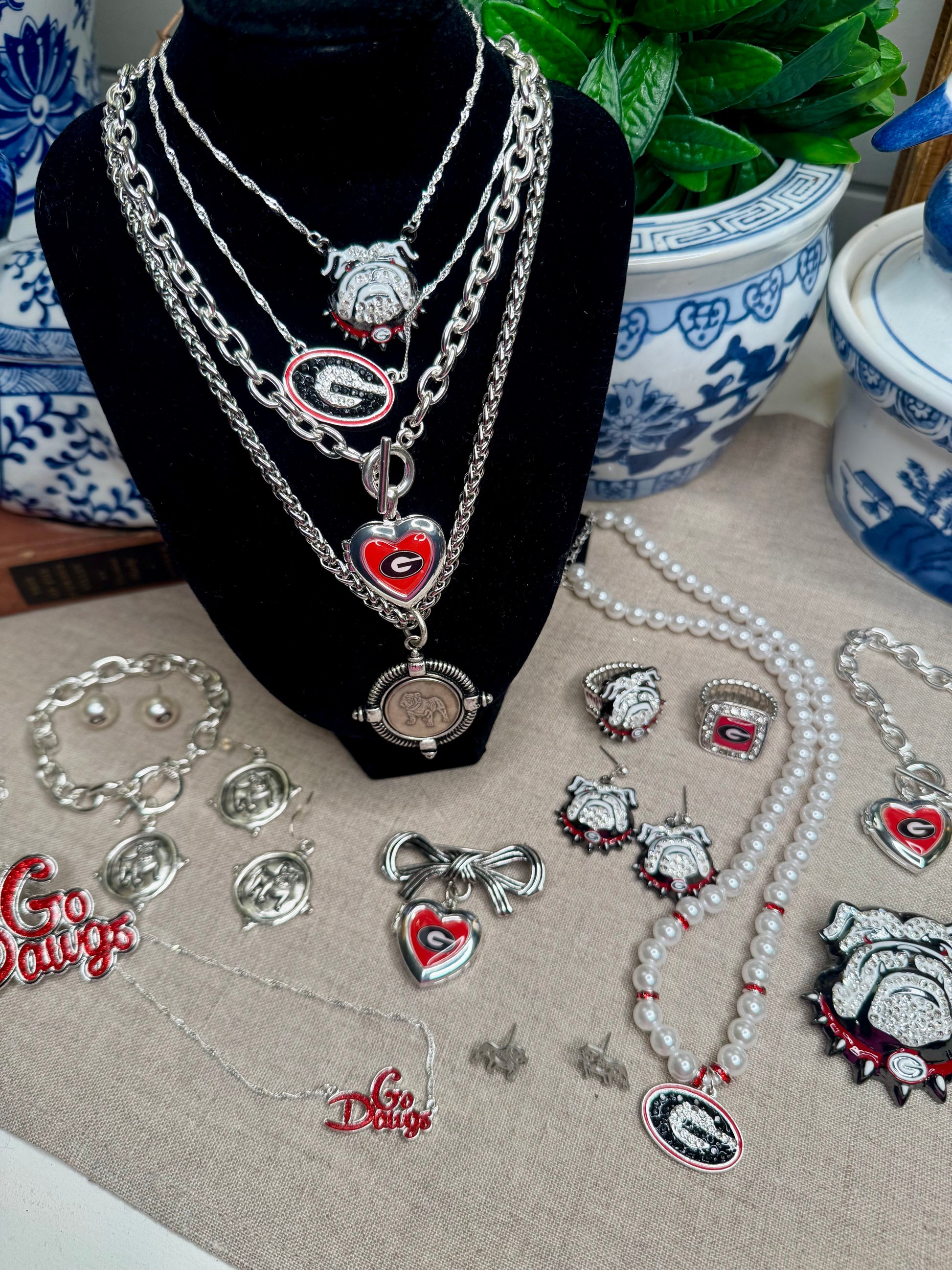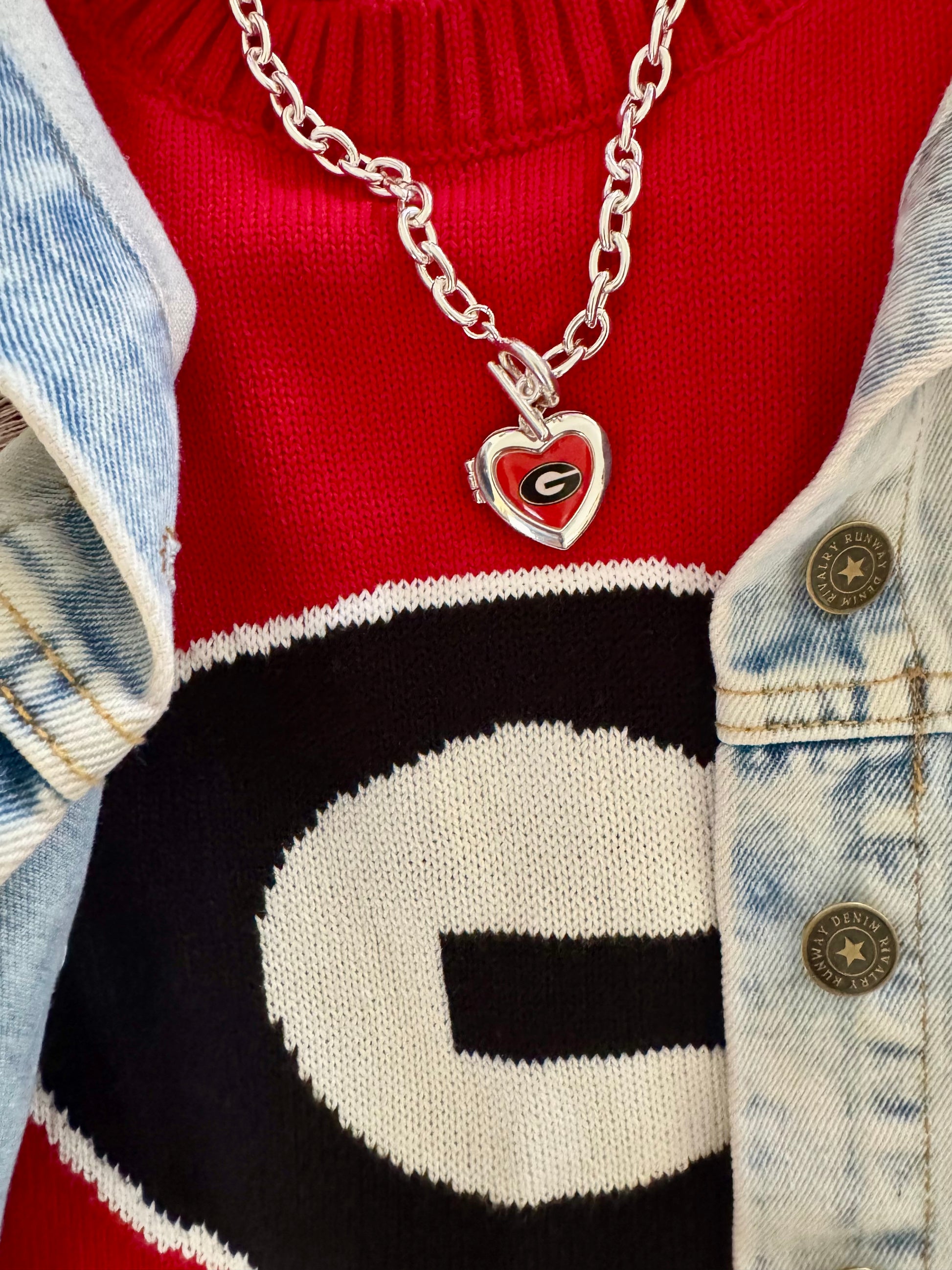 Zinc alloy, and sealed with anti tarnish coating. Says Go dawgs inside locket.