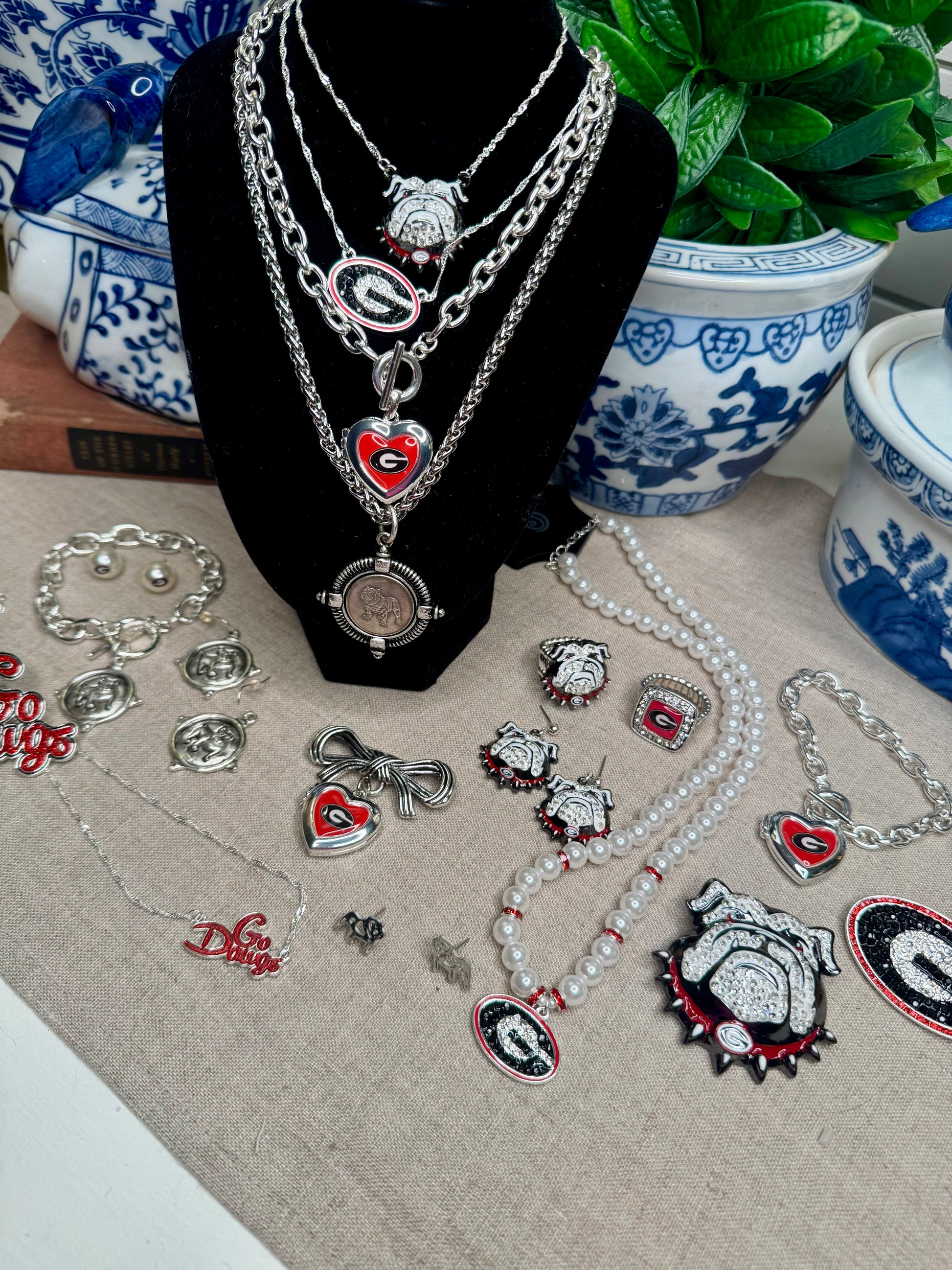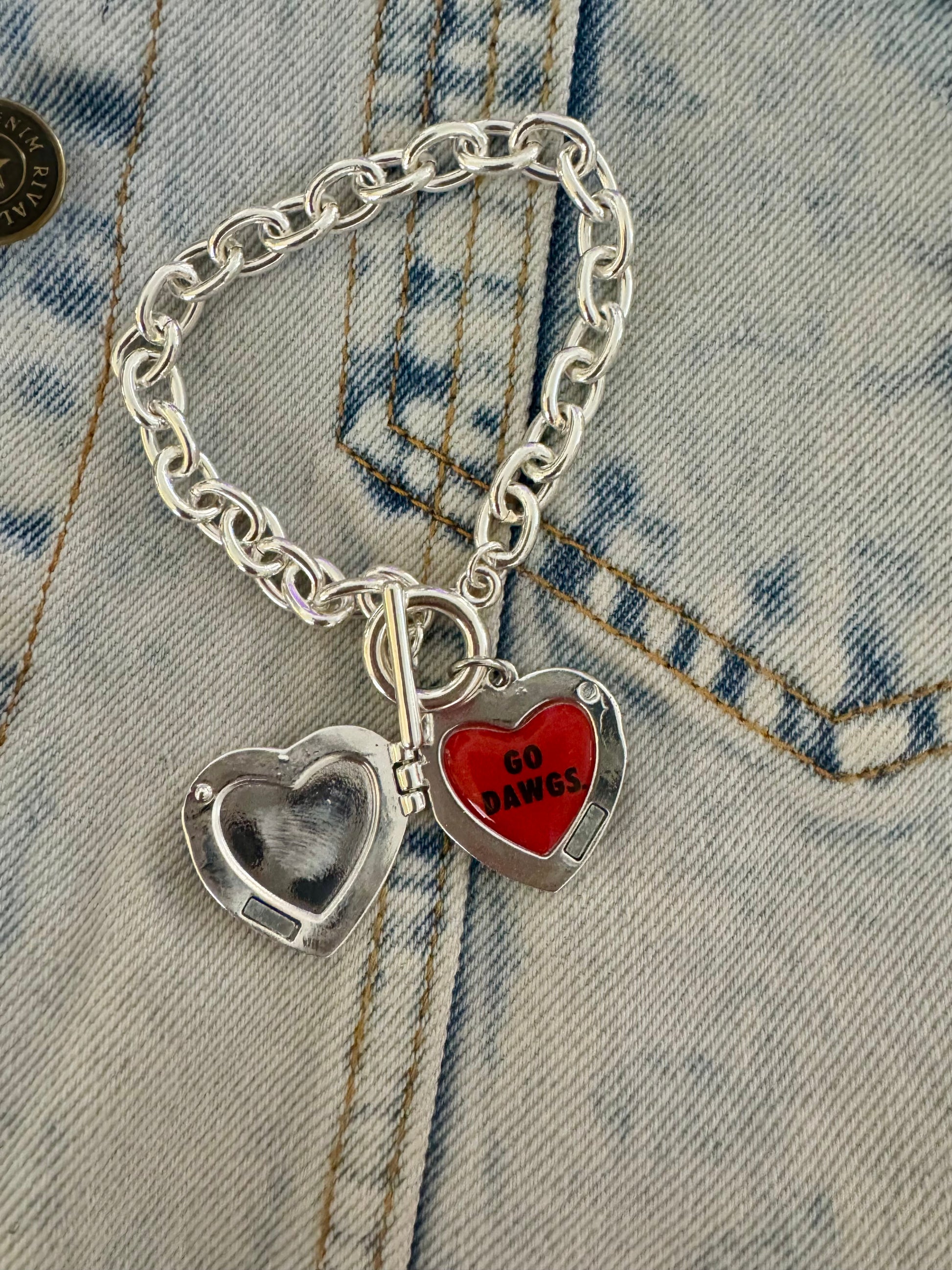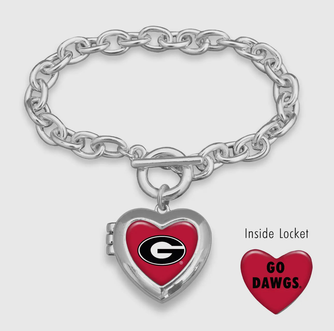 Zinc alloy, and sealed with anti tarnish coating. Says Go dawgs inside locket.