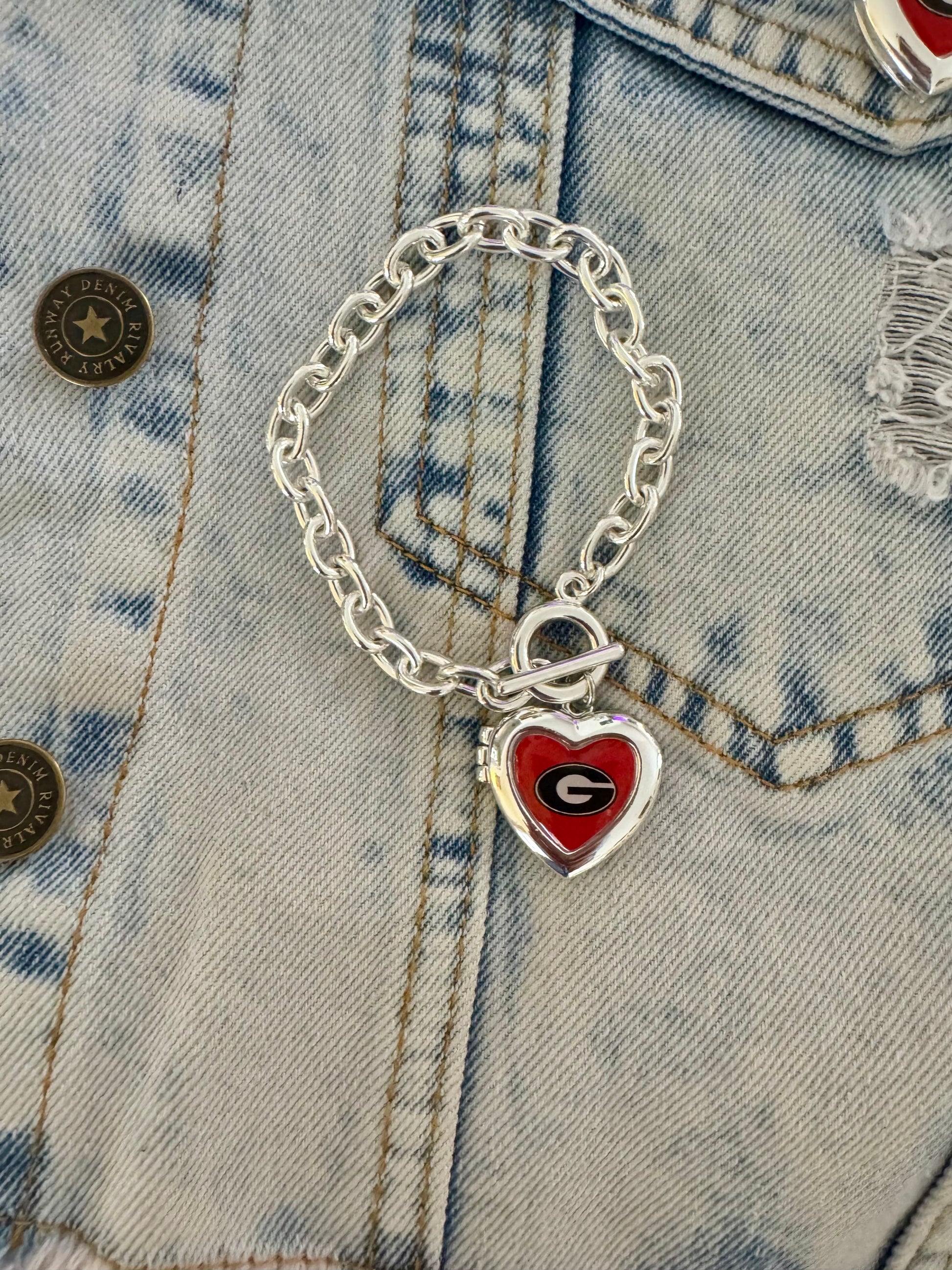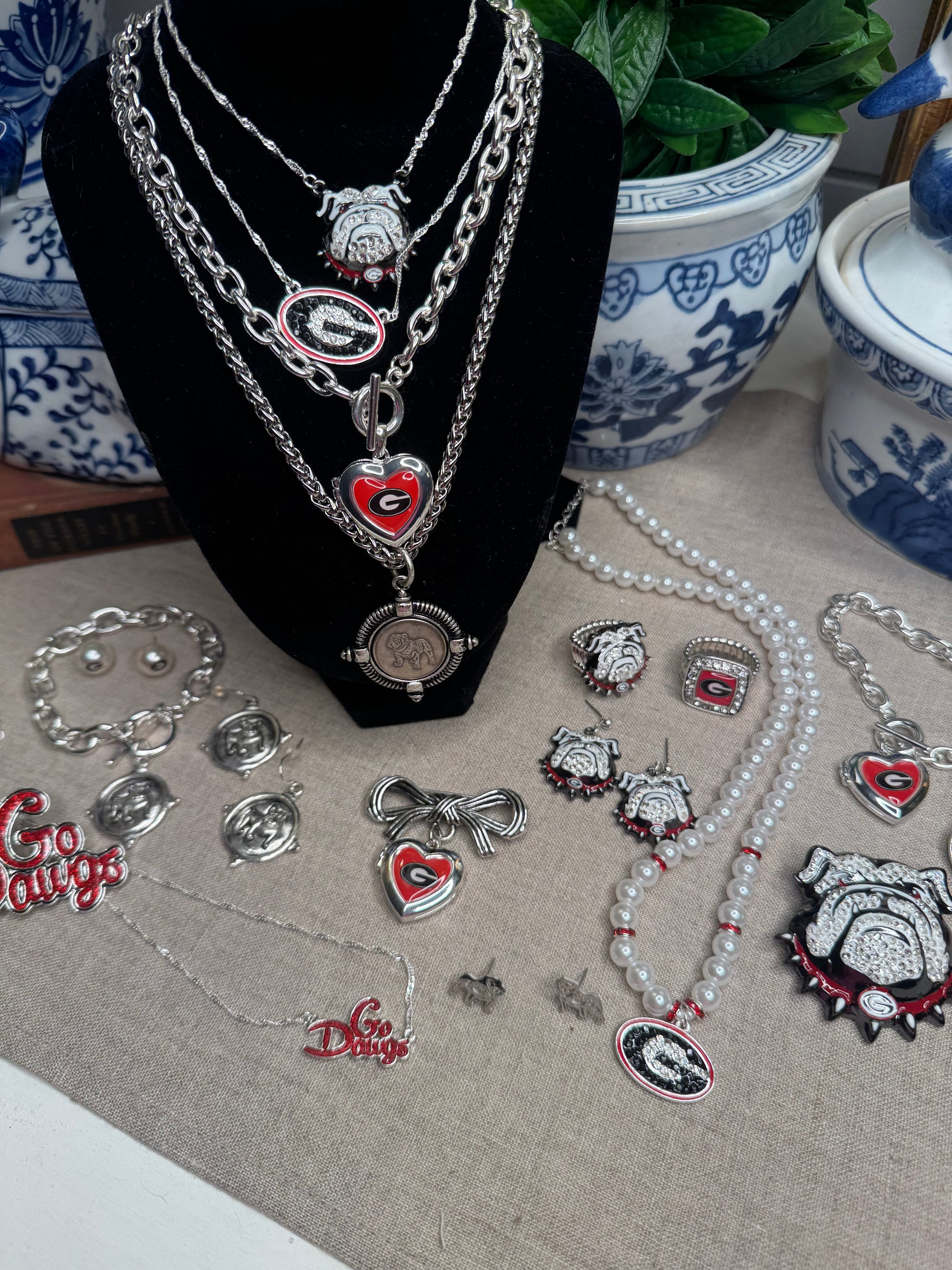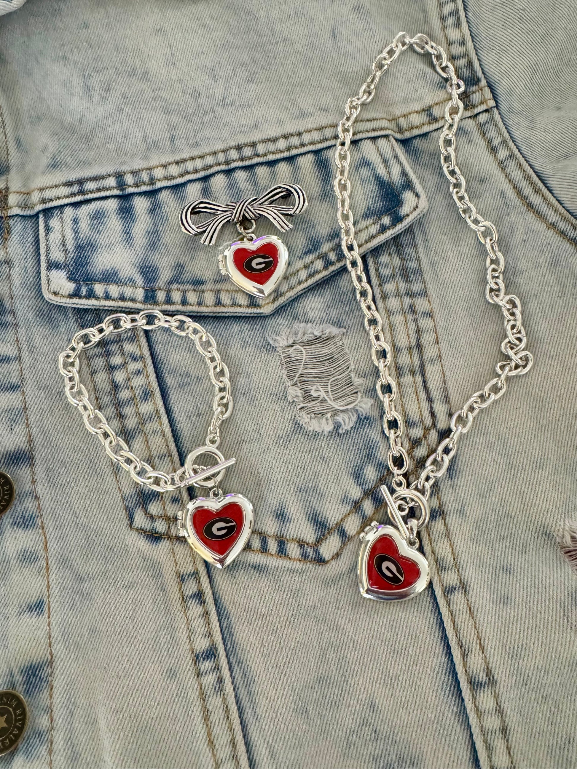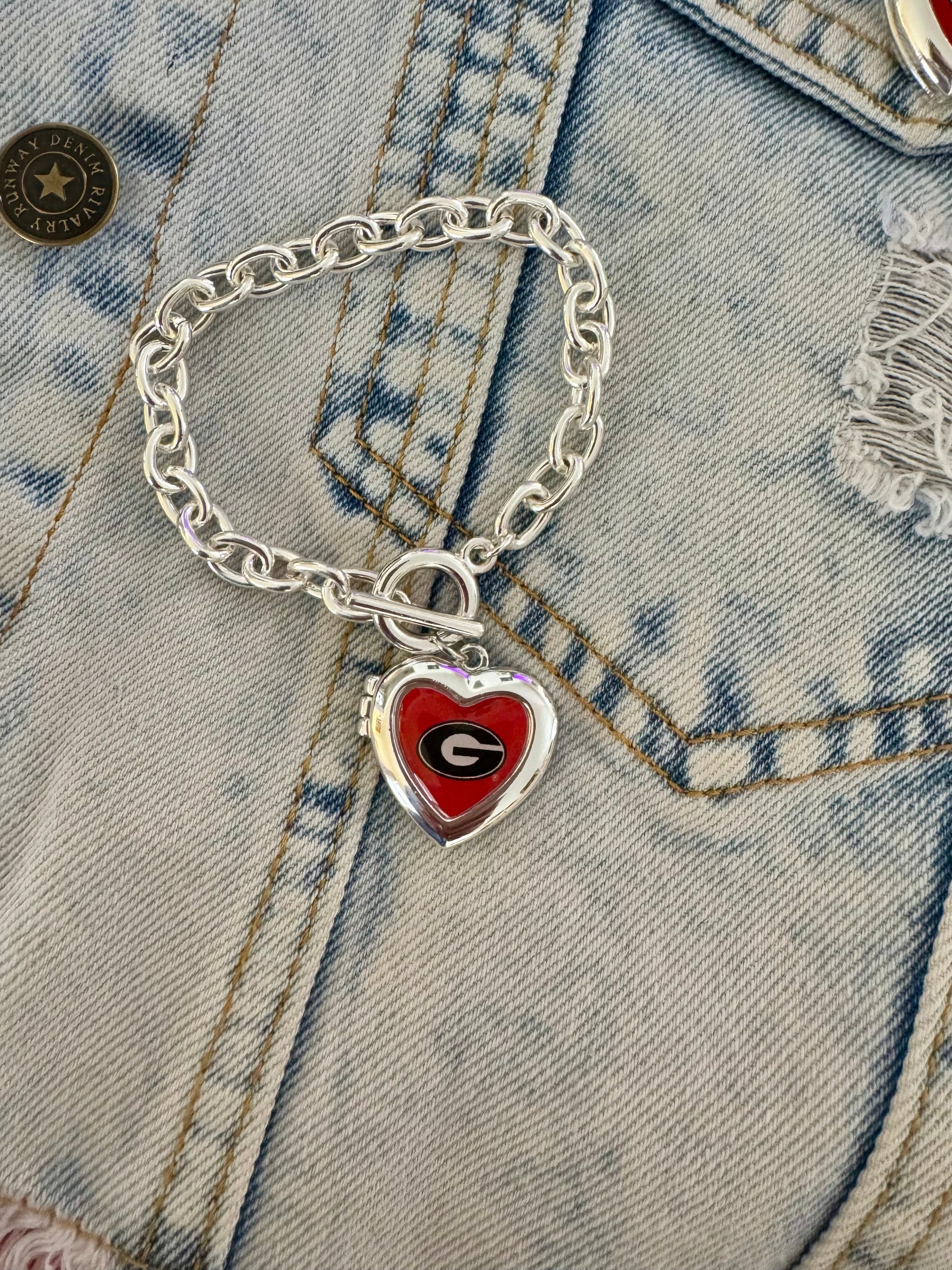 Zinc alloy, and sealed with anti tarnish coating. Says Go dawgs inside locket.