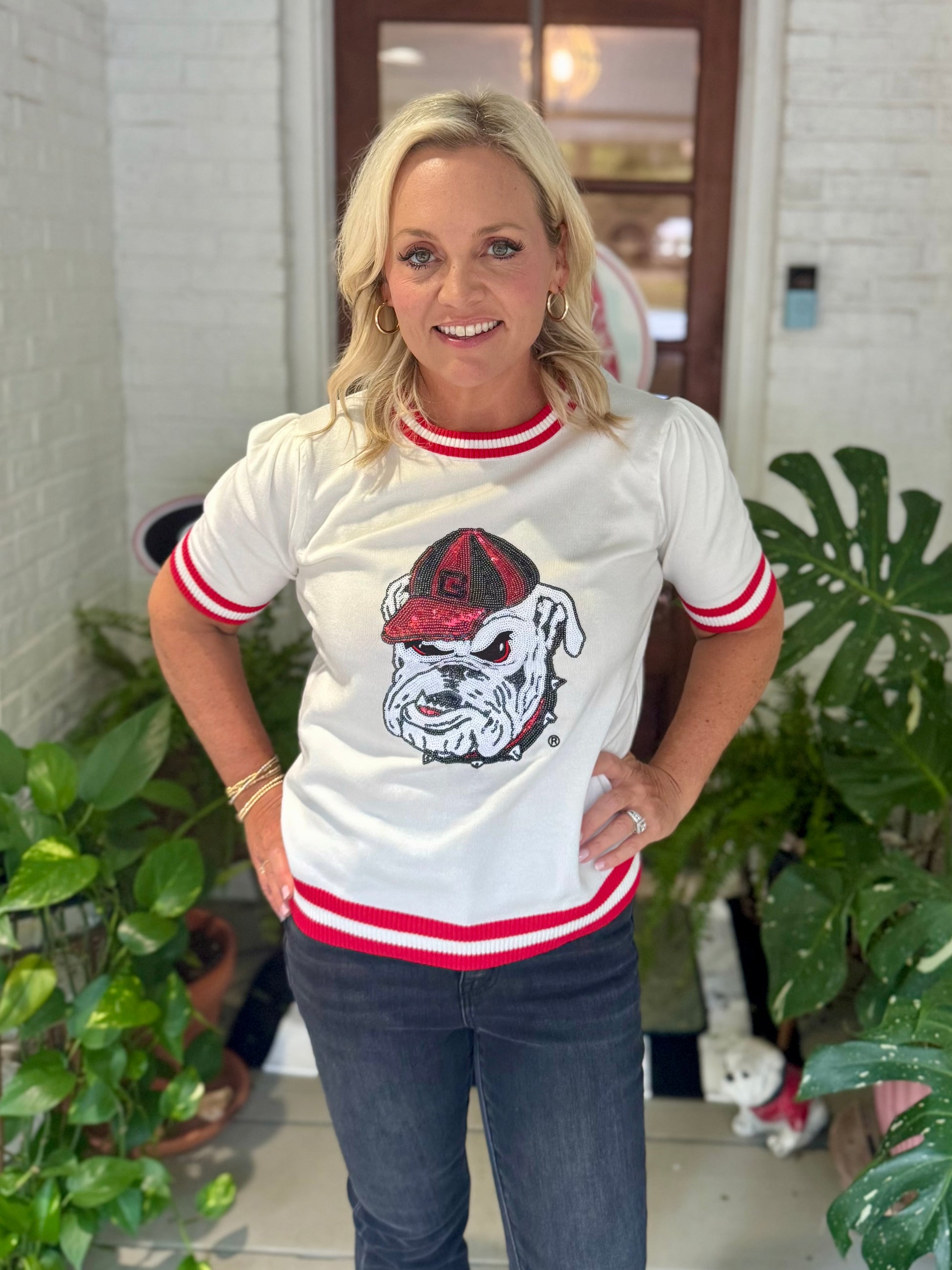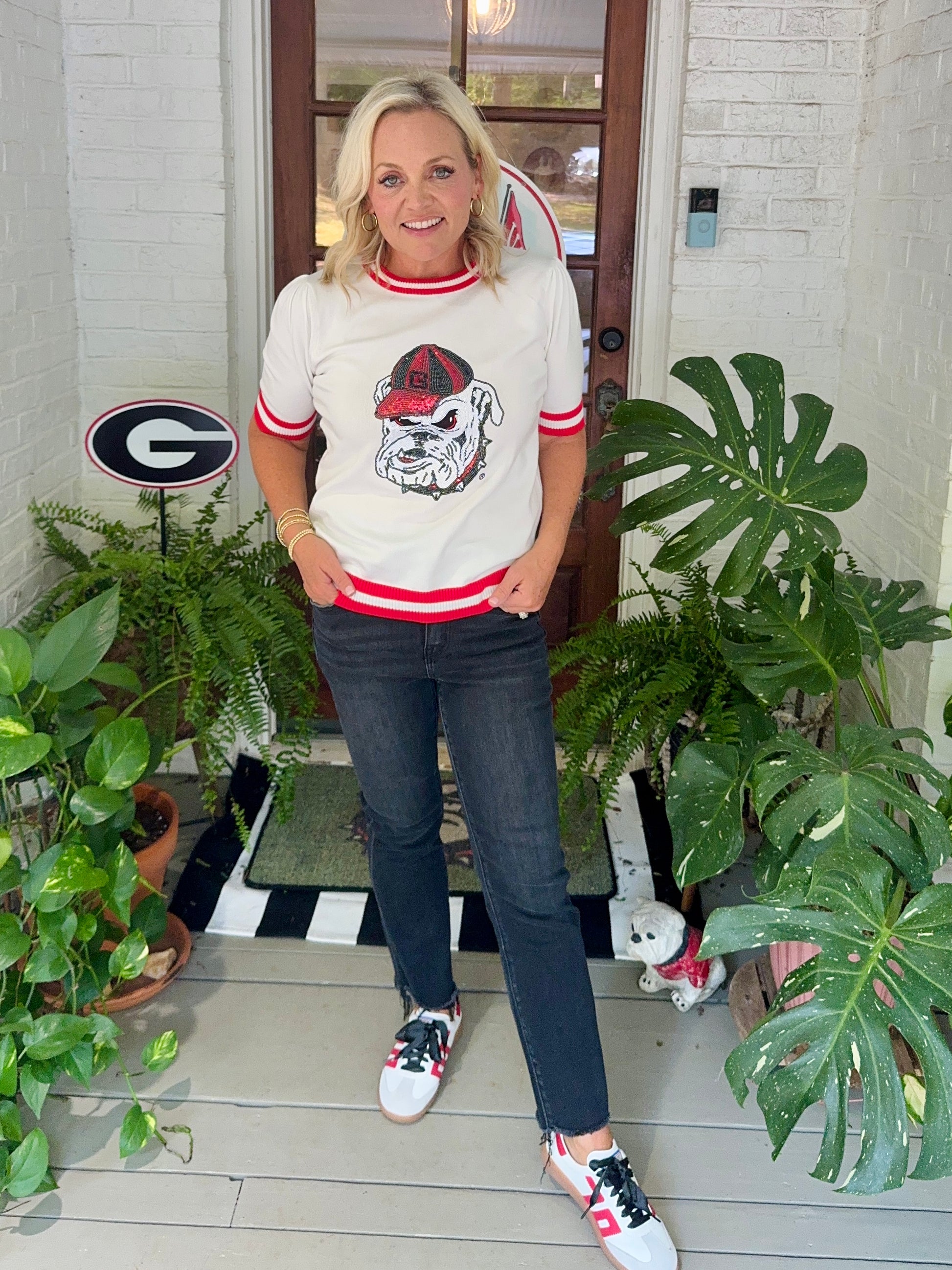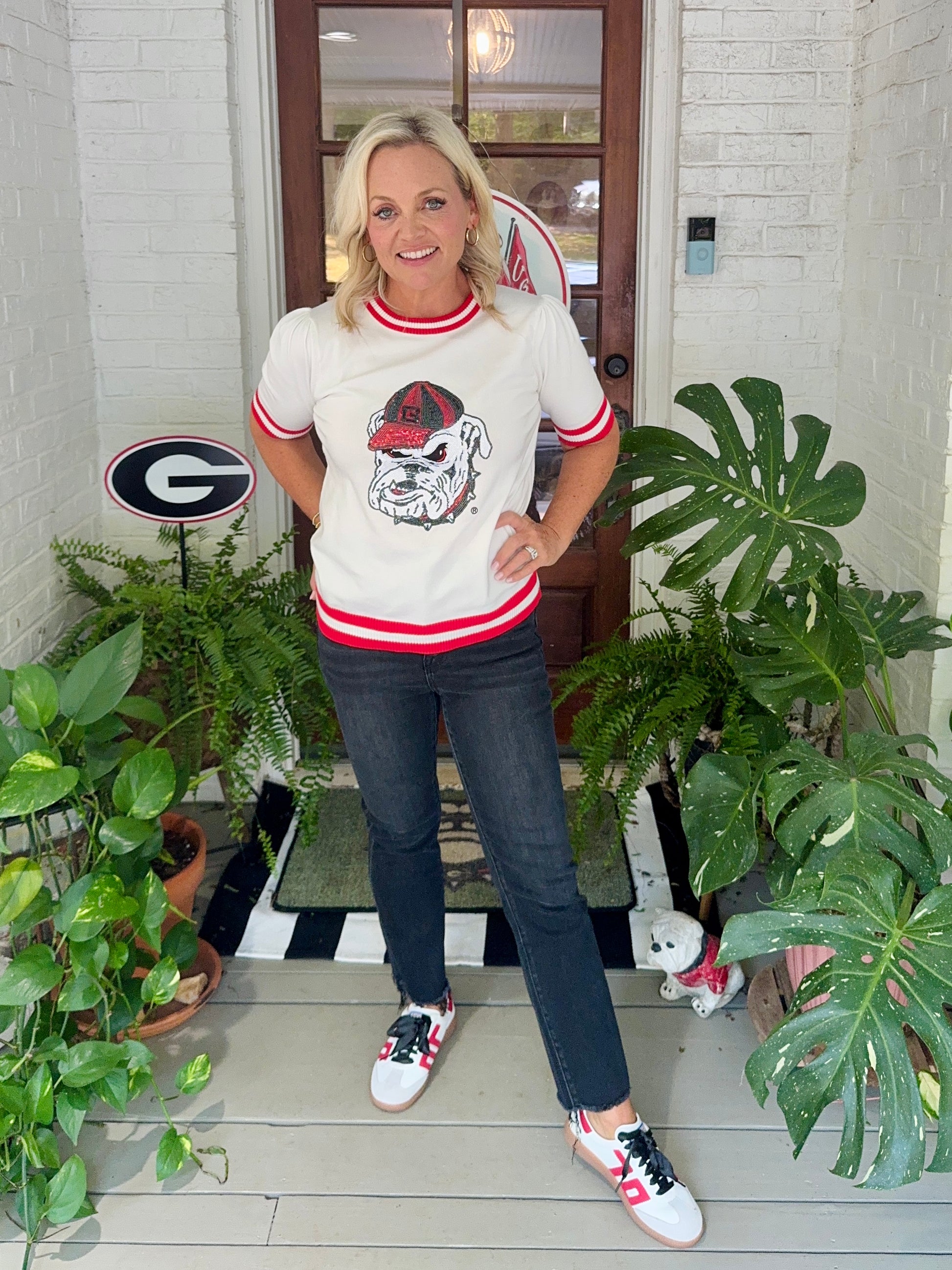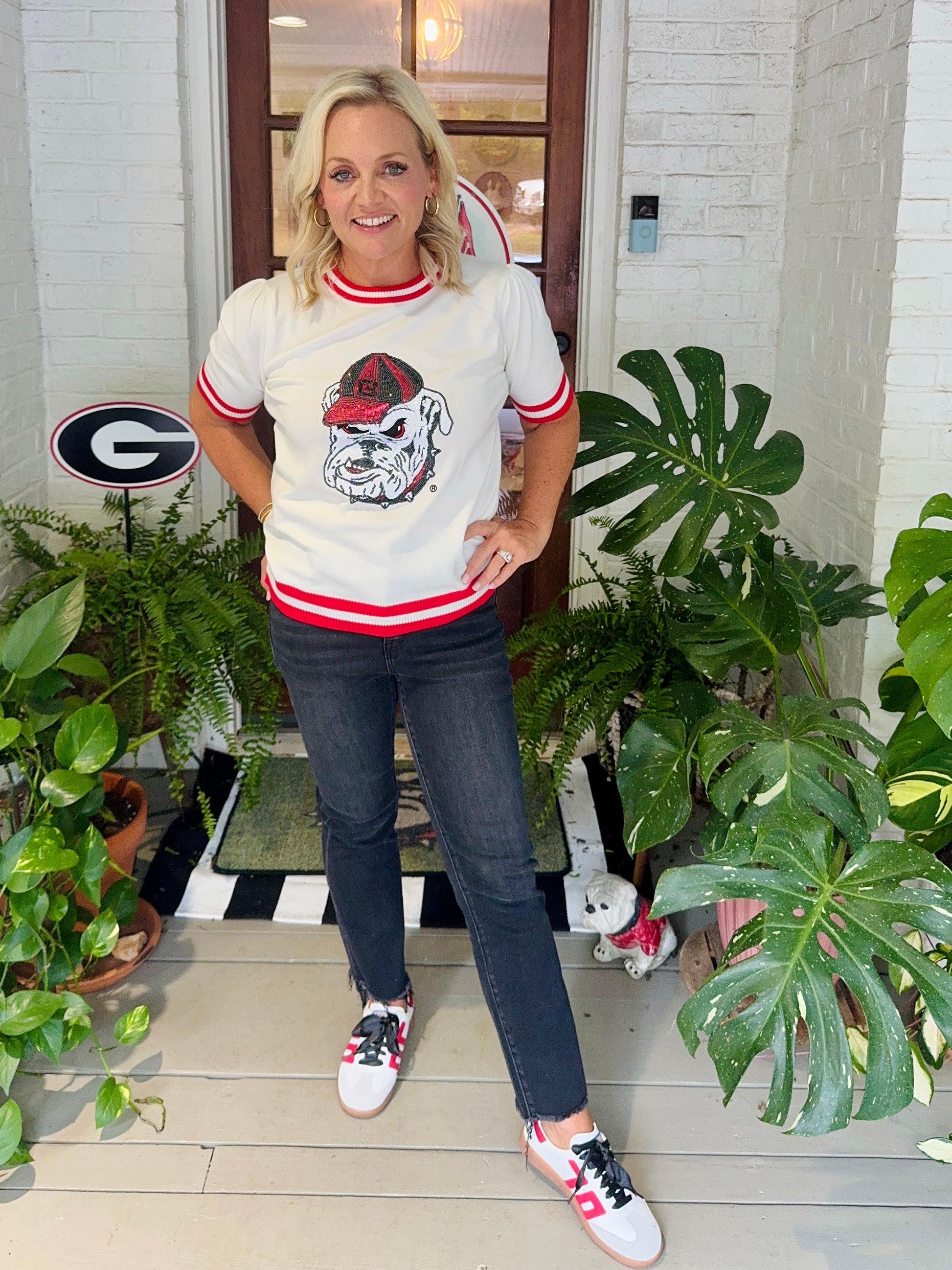 Varsity light weight knit sweater with stripe neckline sequin bulldog