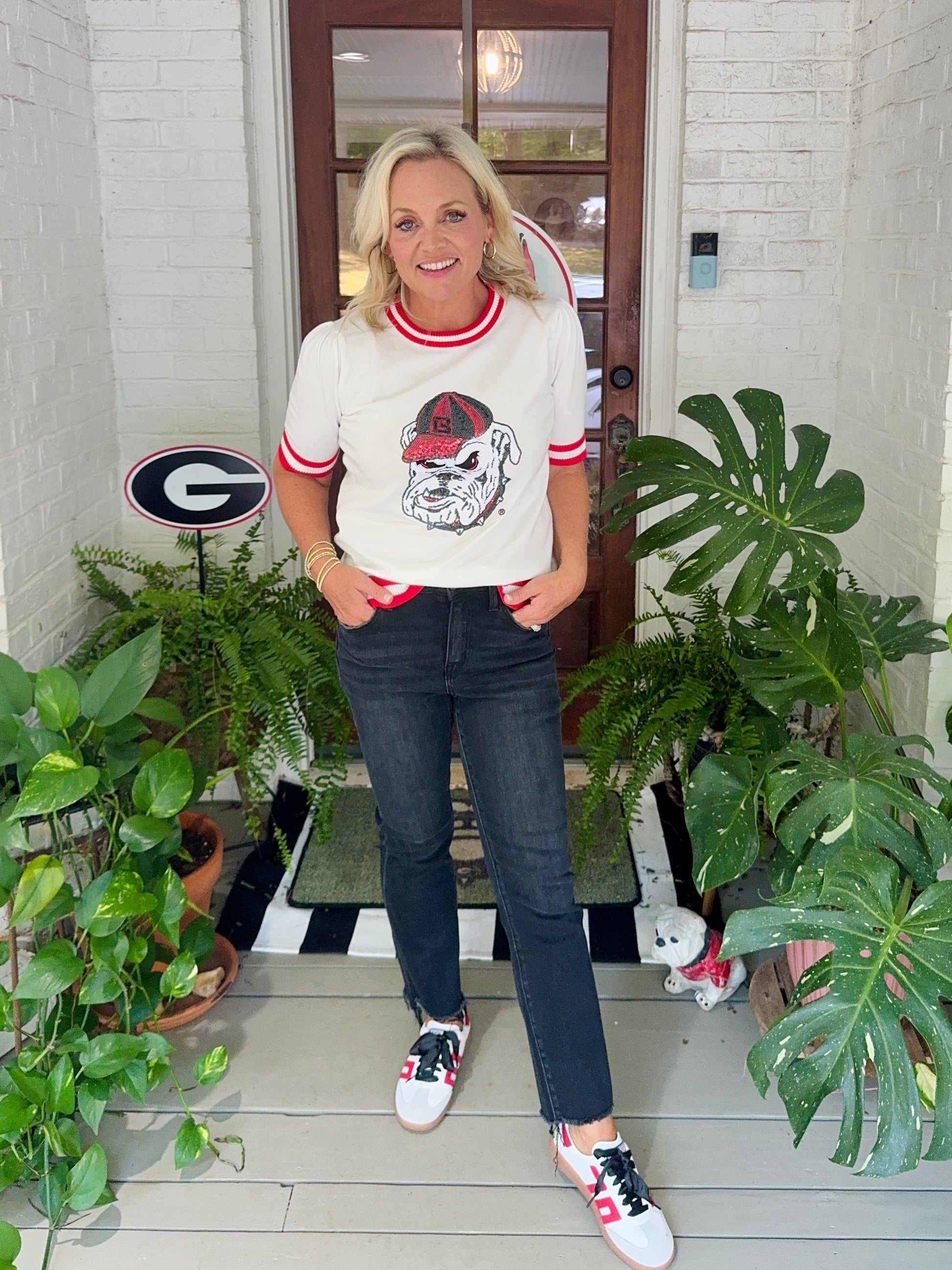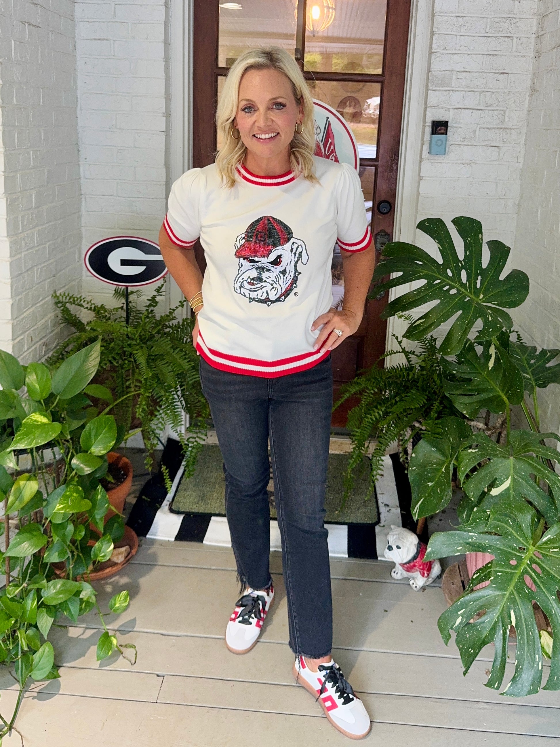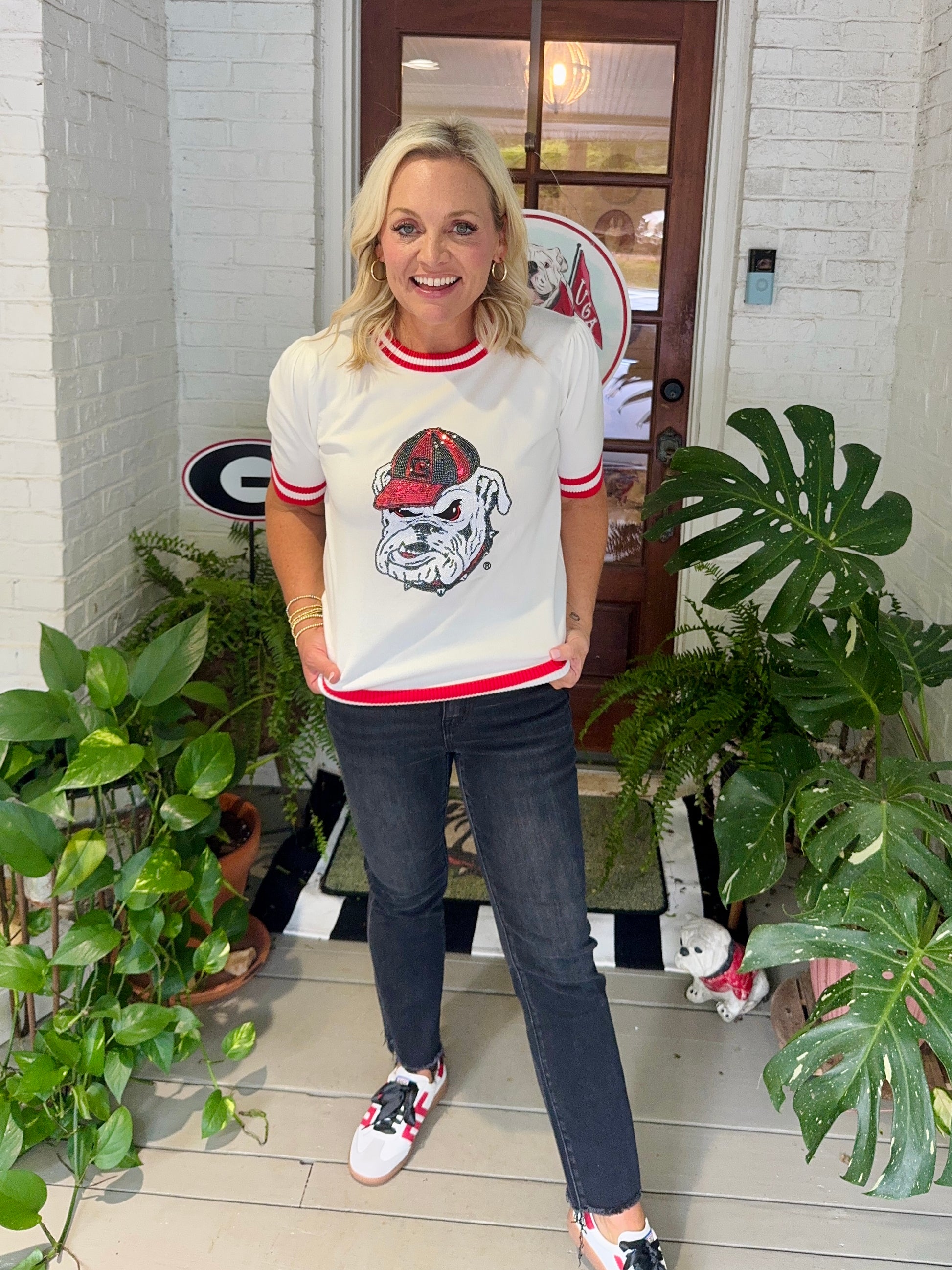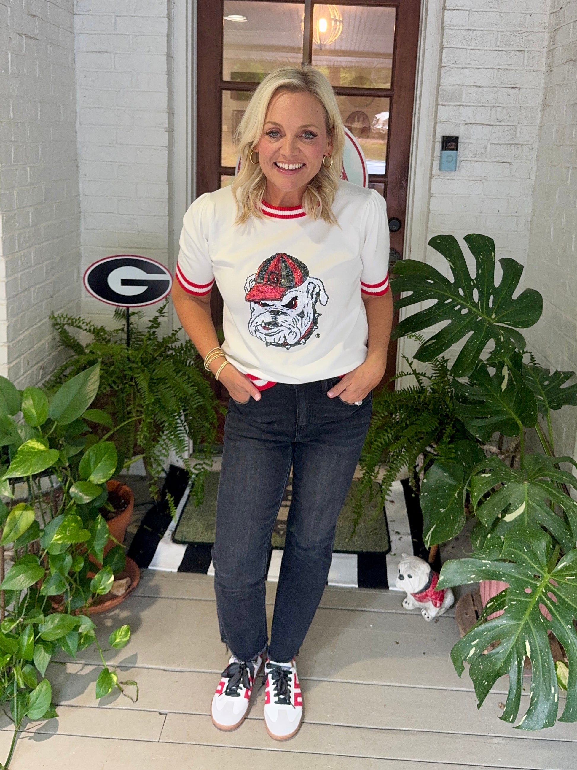 Varsity light weight knit sweater with stripe neckline sequin bulldog