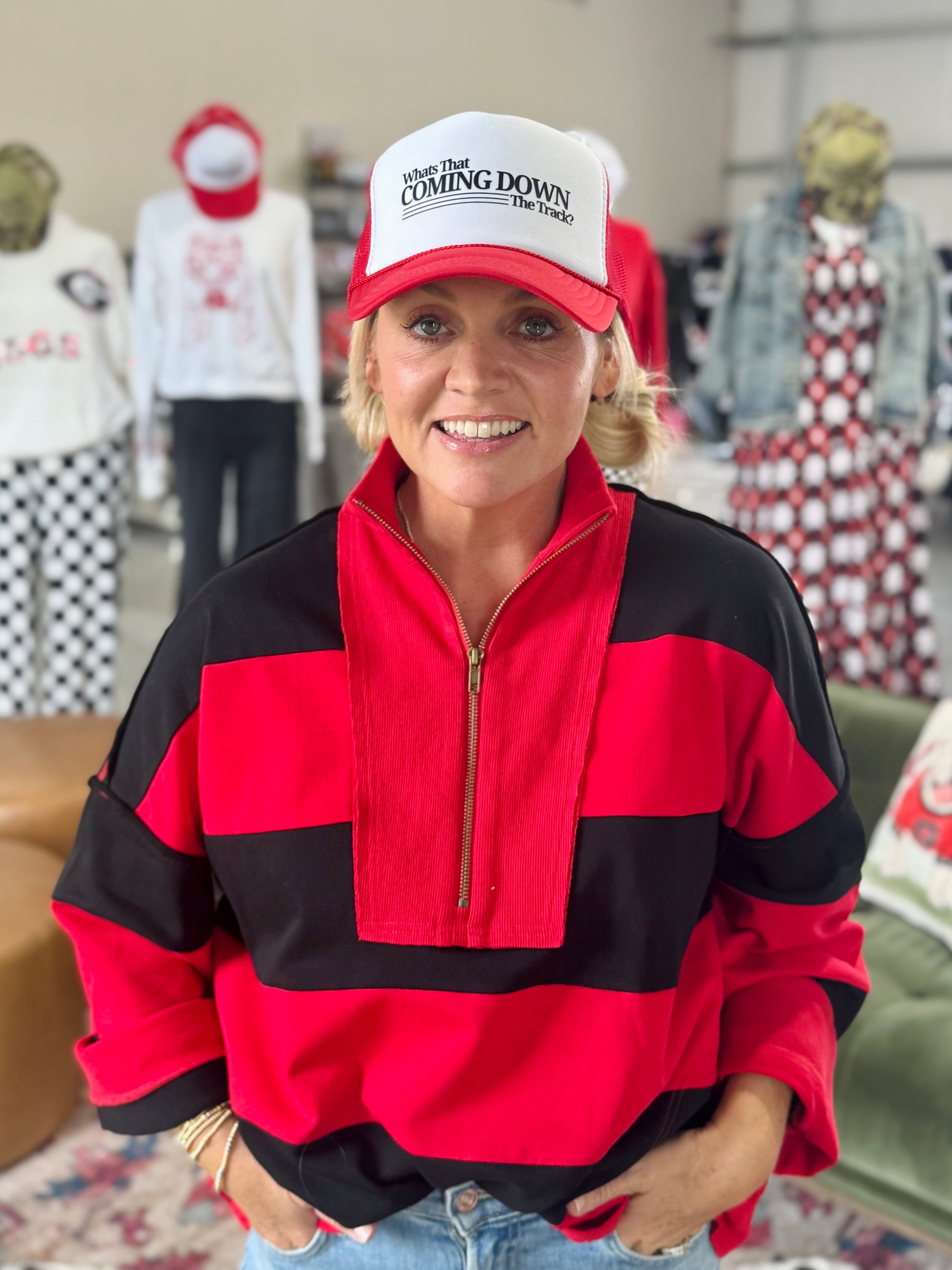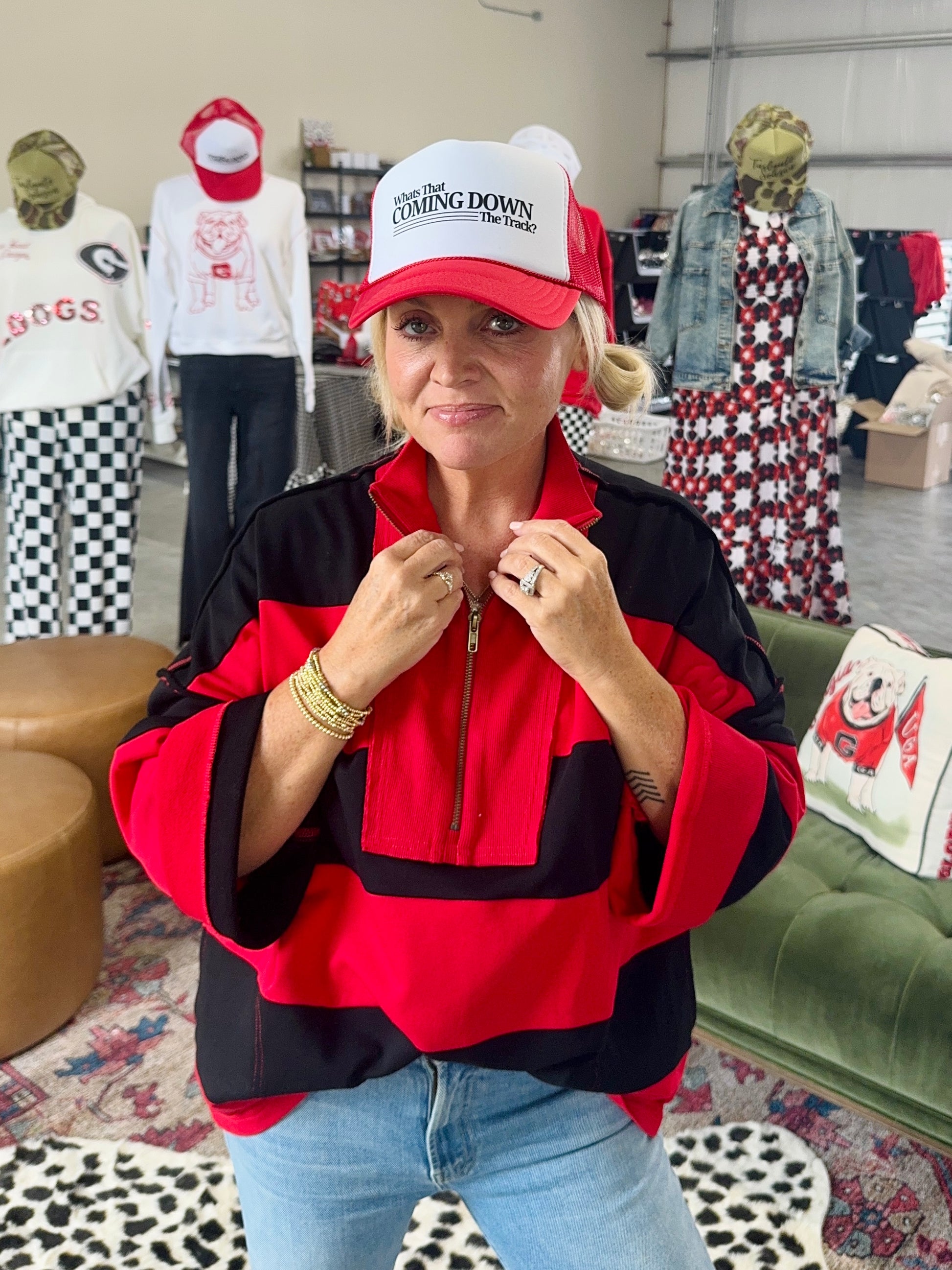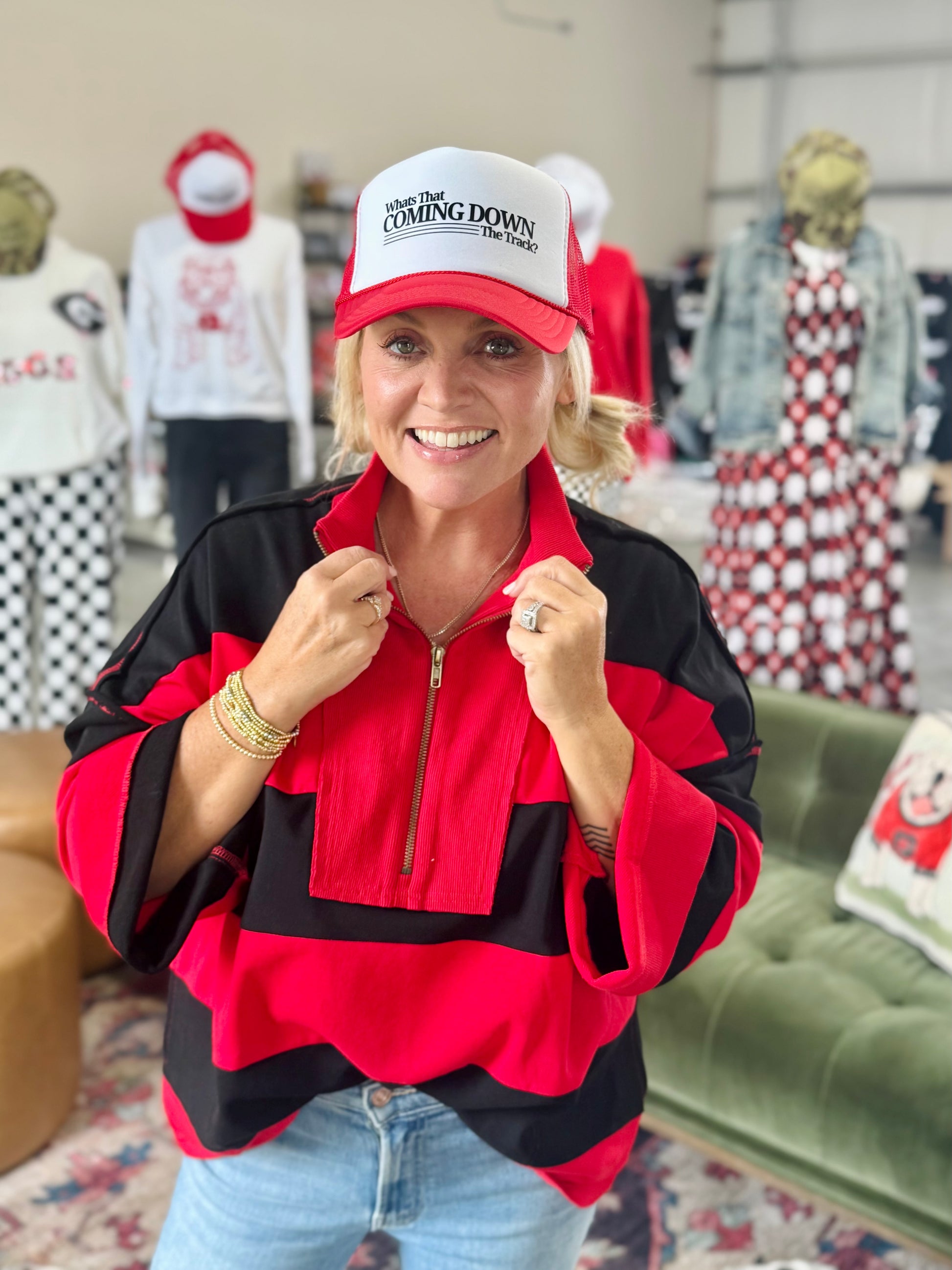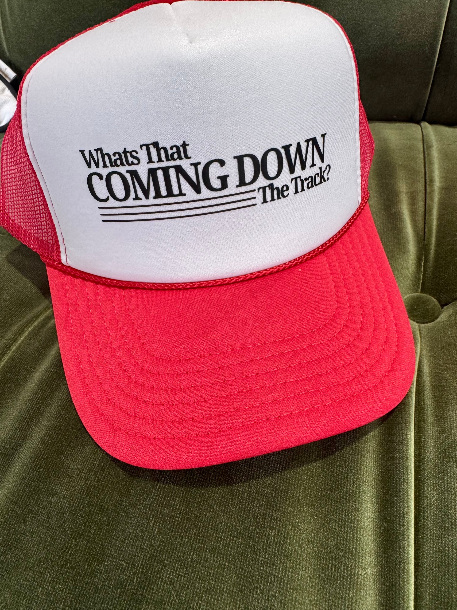 Red and white trucker with “what’s that coming down the track ” so cute! Adjustable!