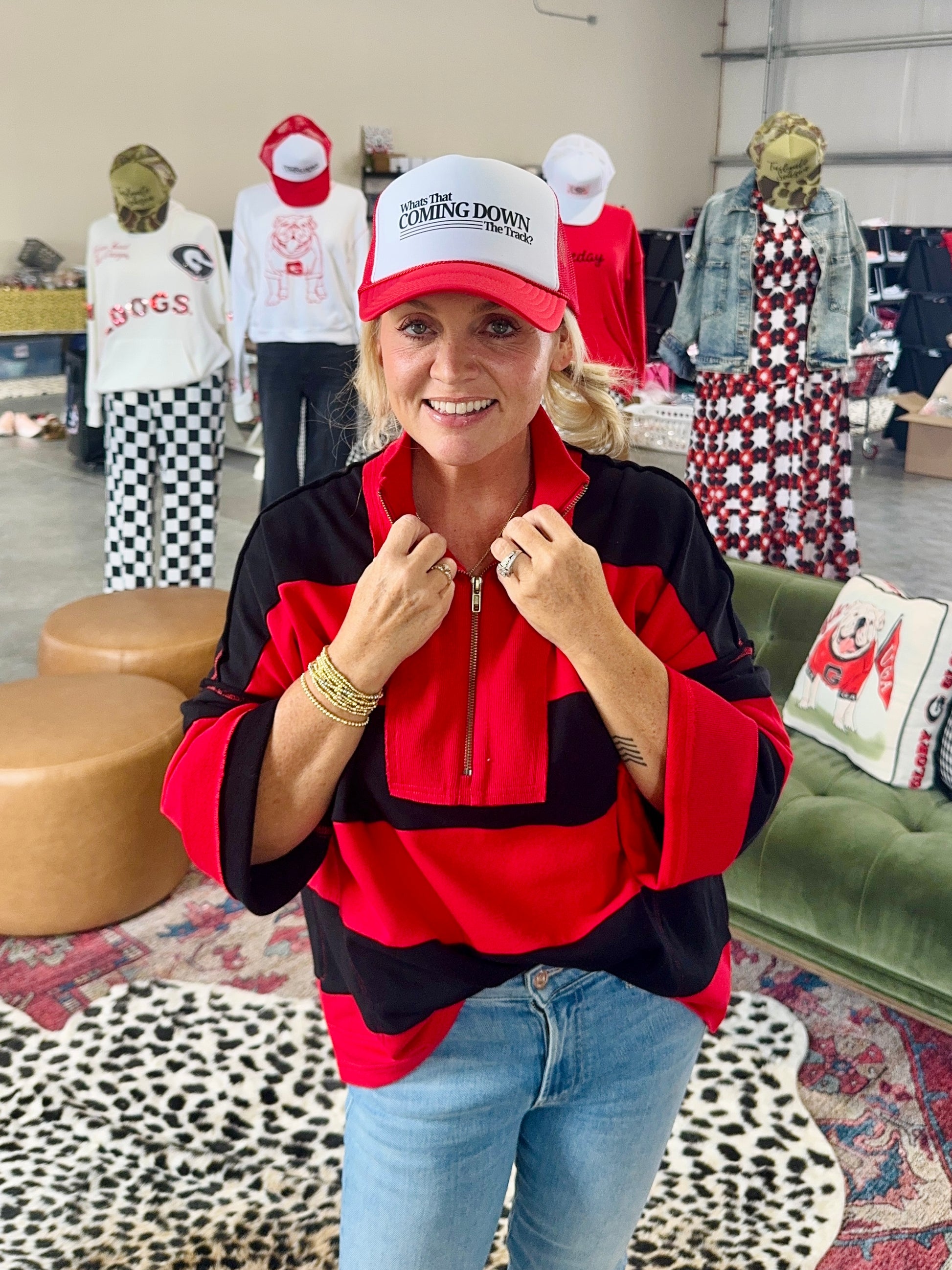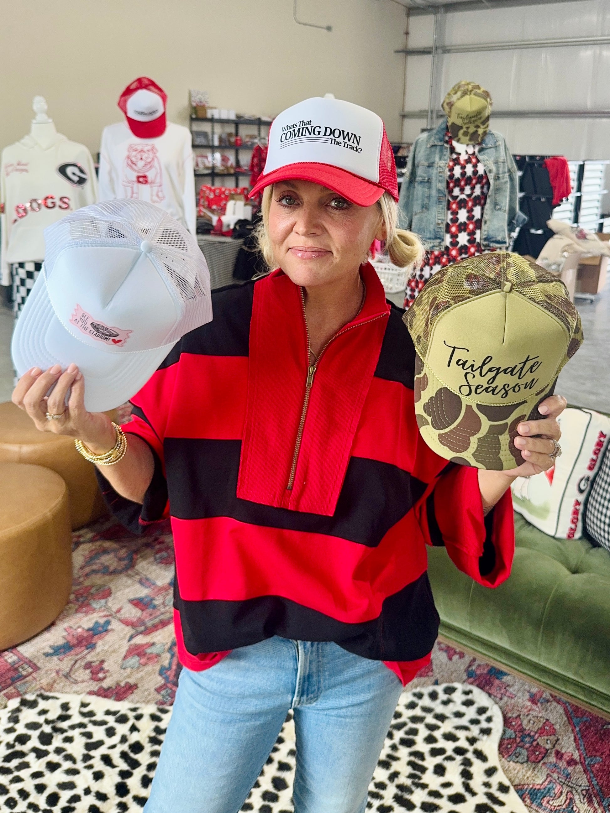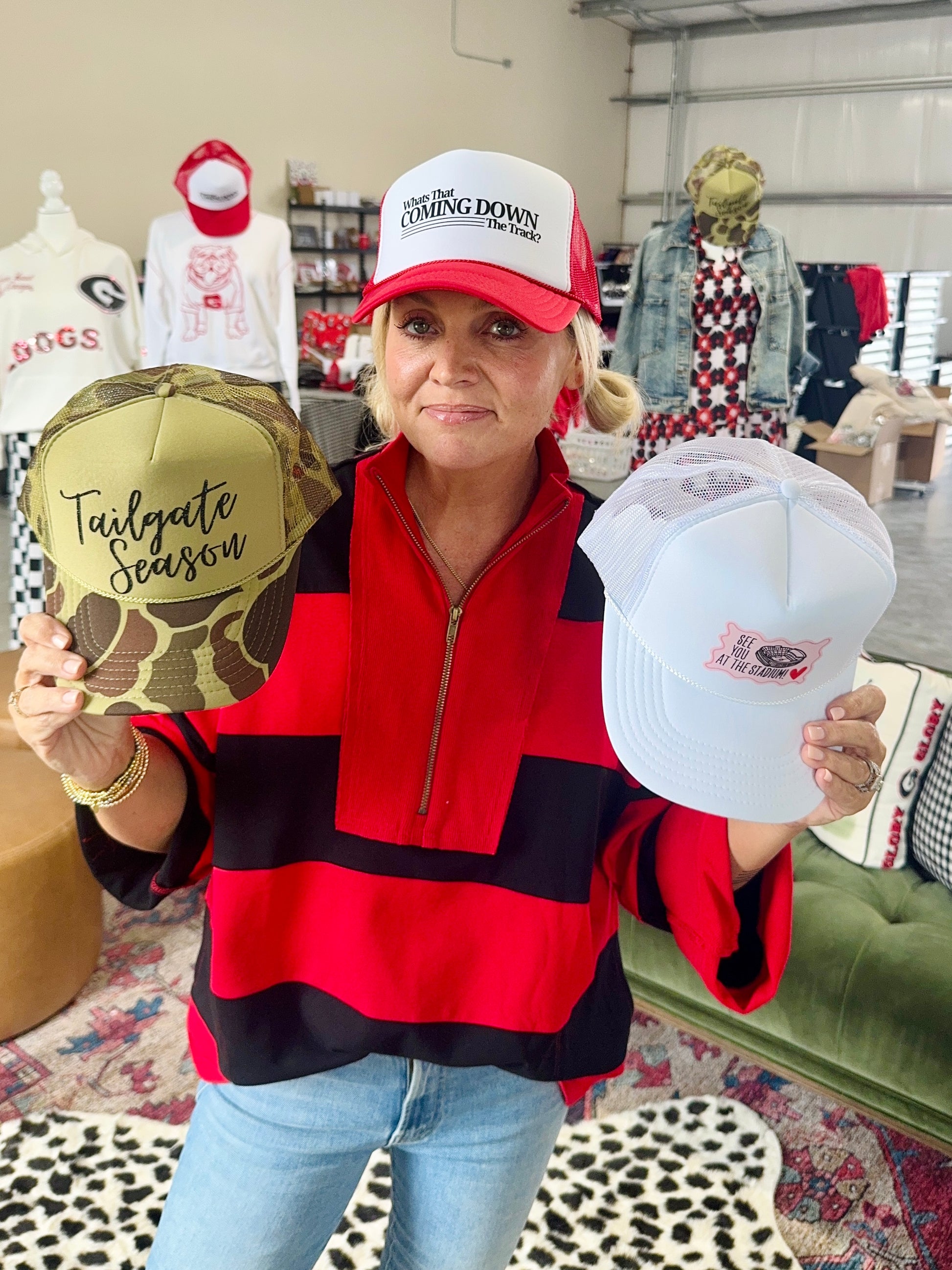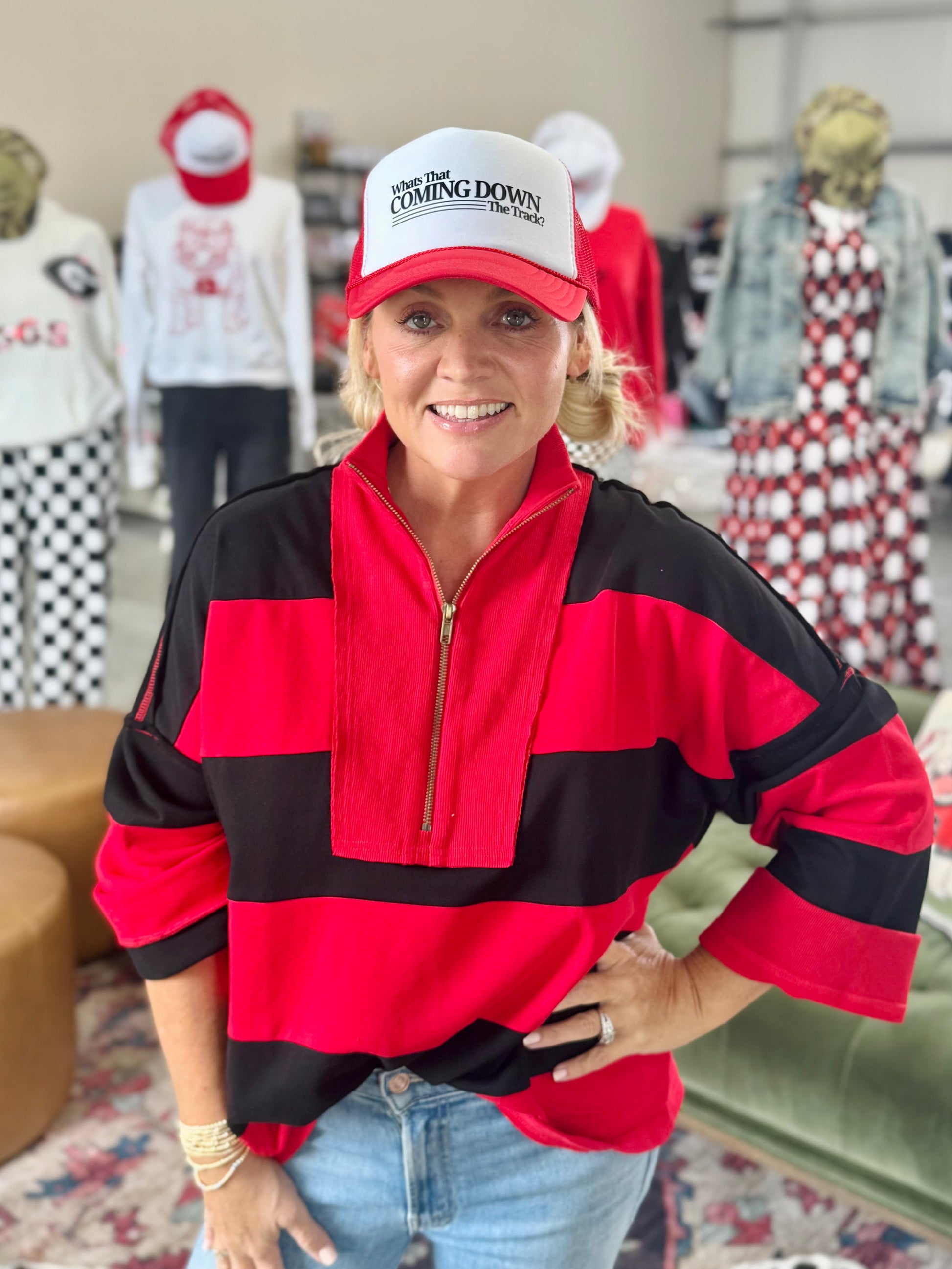 Red and white trucker with “what’s that coming down the track ” so cute! Adjustable!