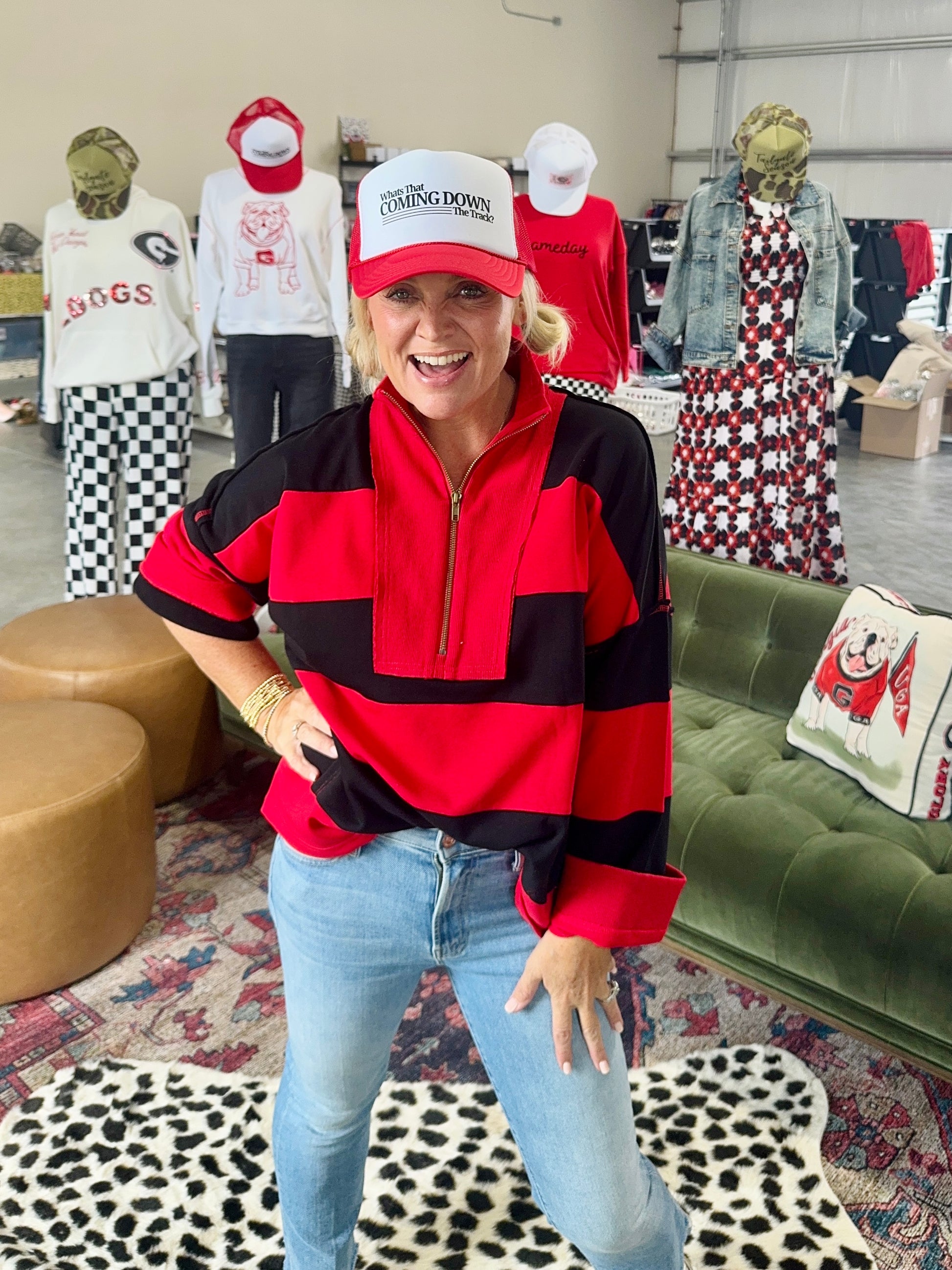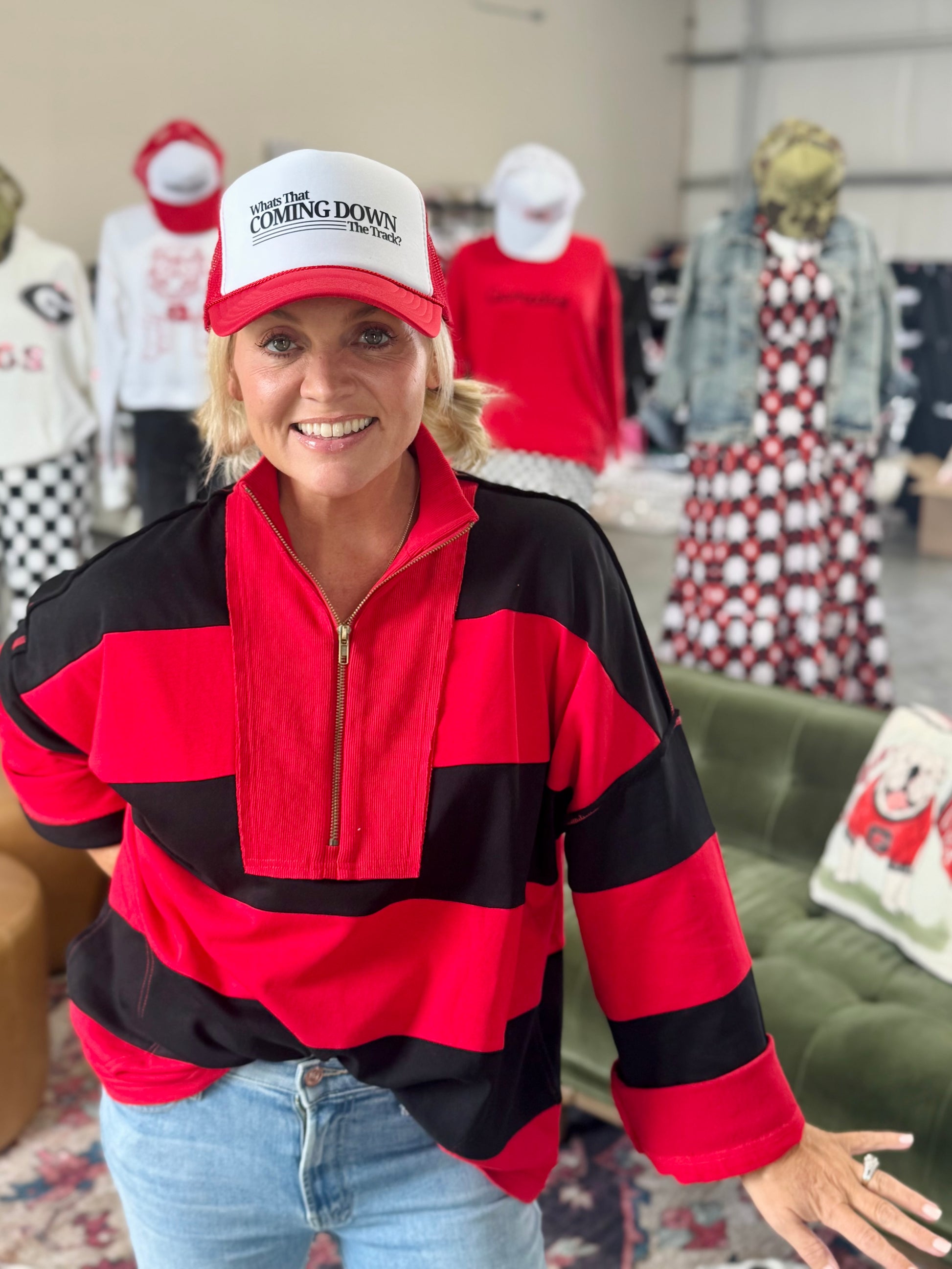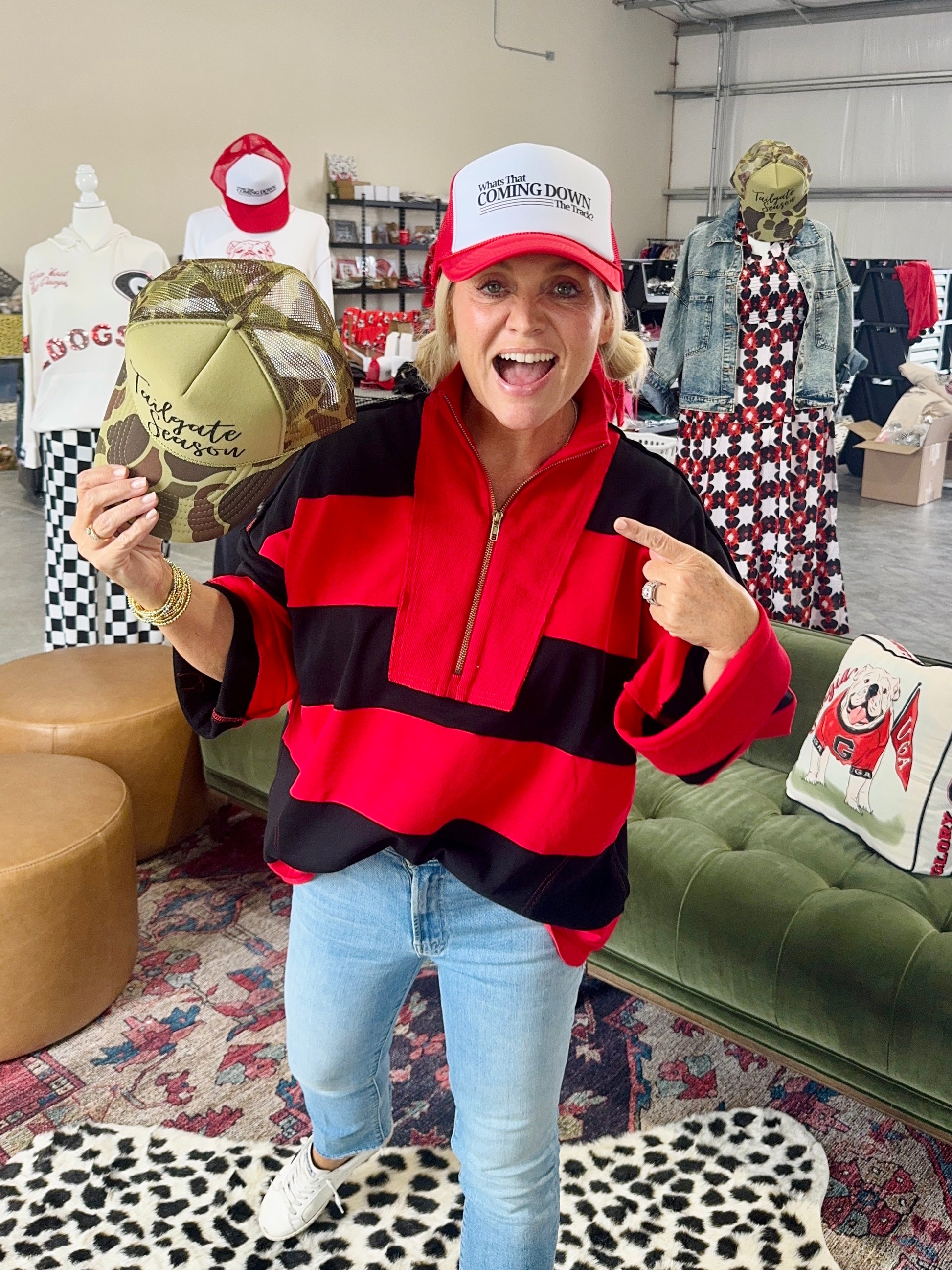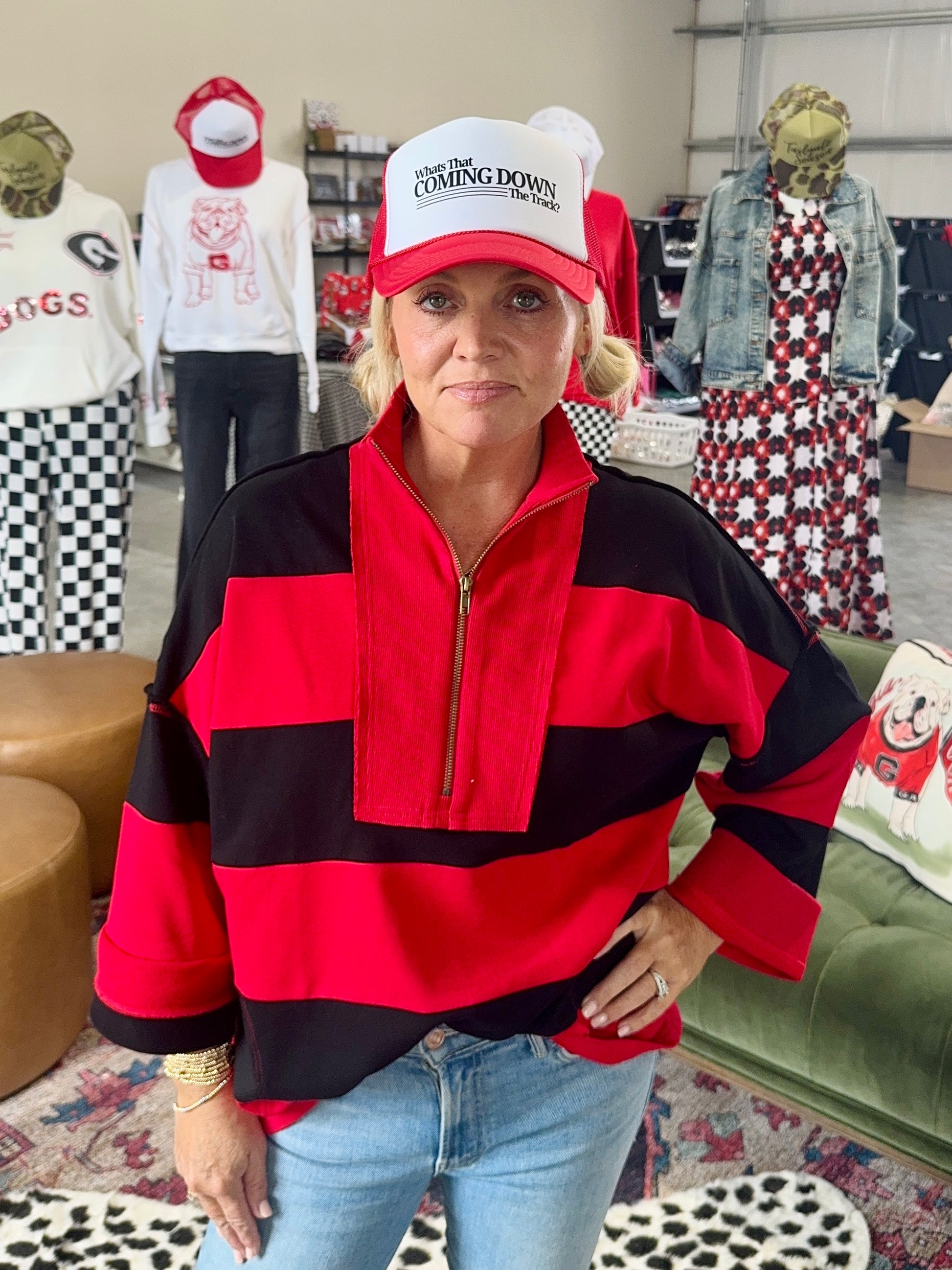 Red and white trucker with “what’s that coming down the track ” so cute! Adjustable!