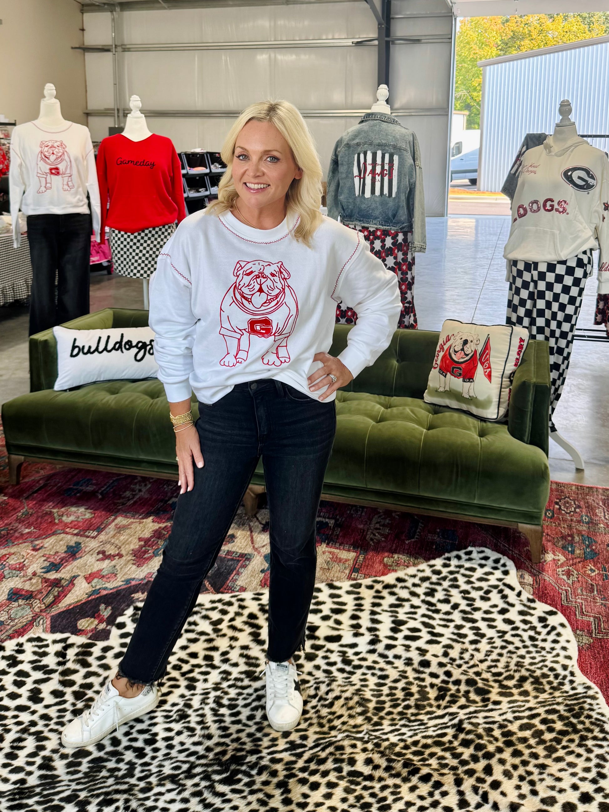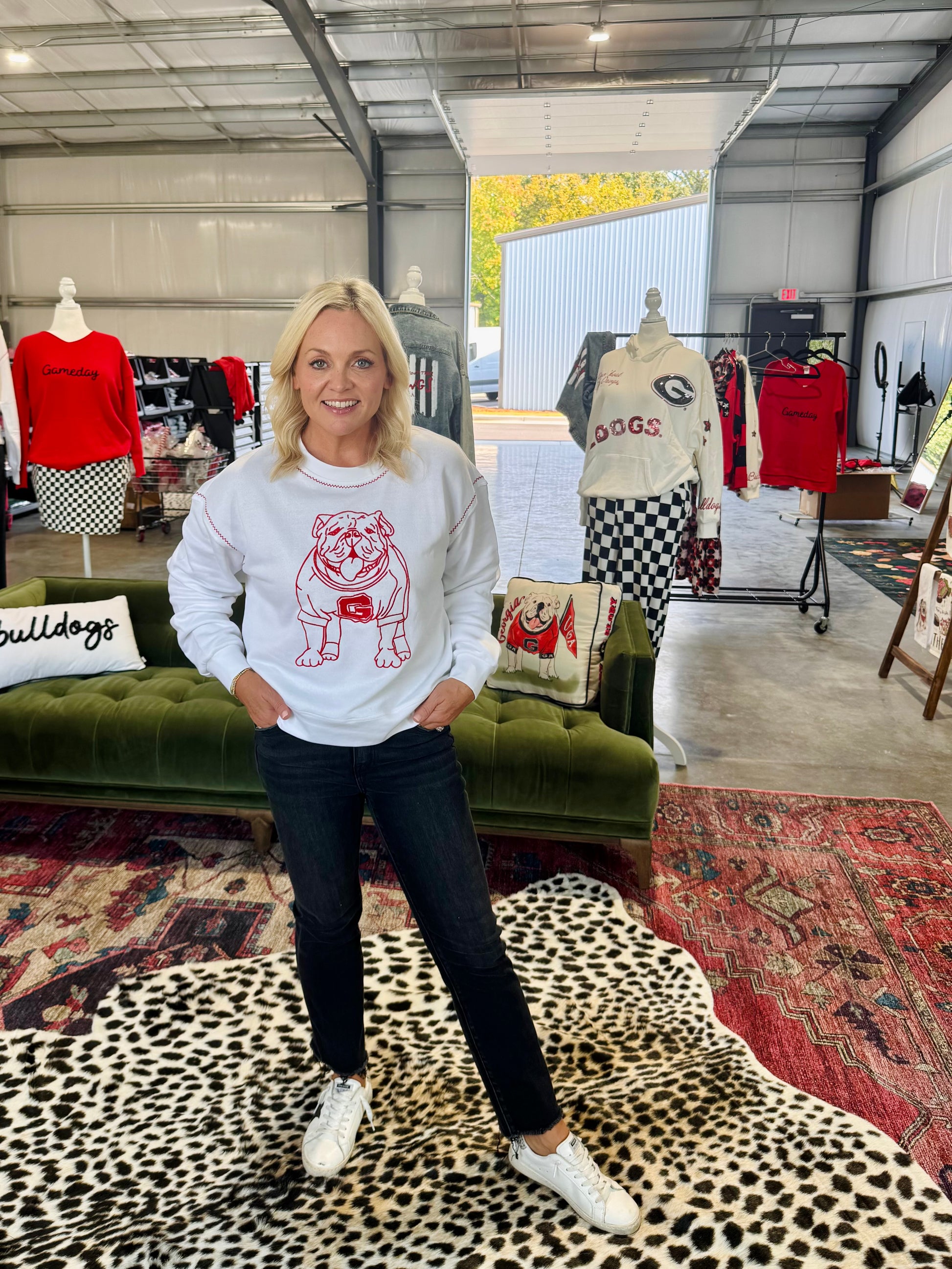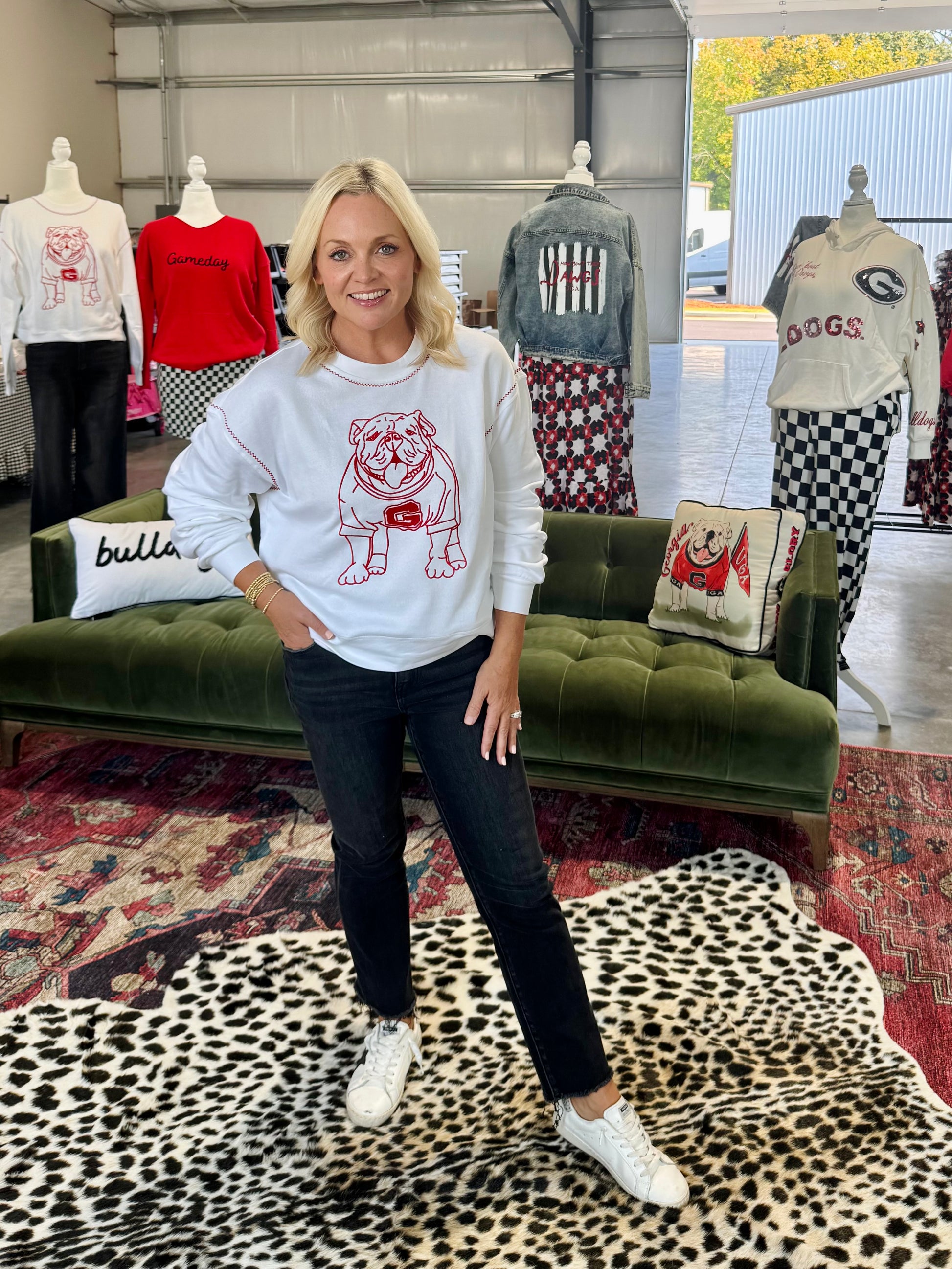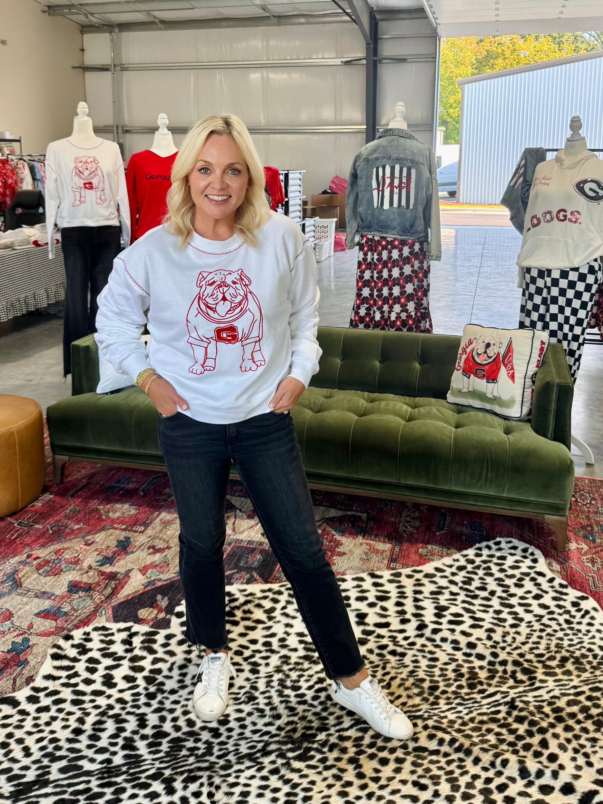 This relaxed sweatshirt elevates the everyday with intricate zig-zag embroidery and a metallic logo that adds texture and subtle shine. Designed with dropped shoulders and crafted from soft cotton fleece, it’s a perfect layering piece that blends timeless style with fresh, elevated details. Pair it with a romantic maxi skirt and ballet flats for an effortless, chic look.